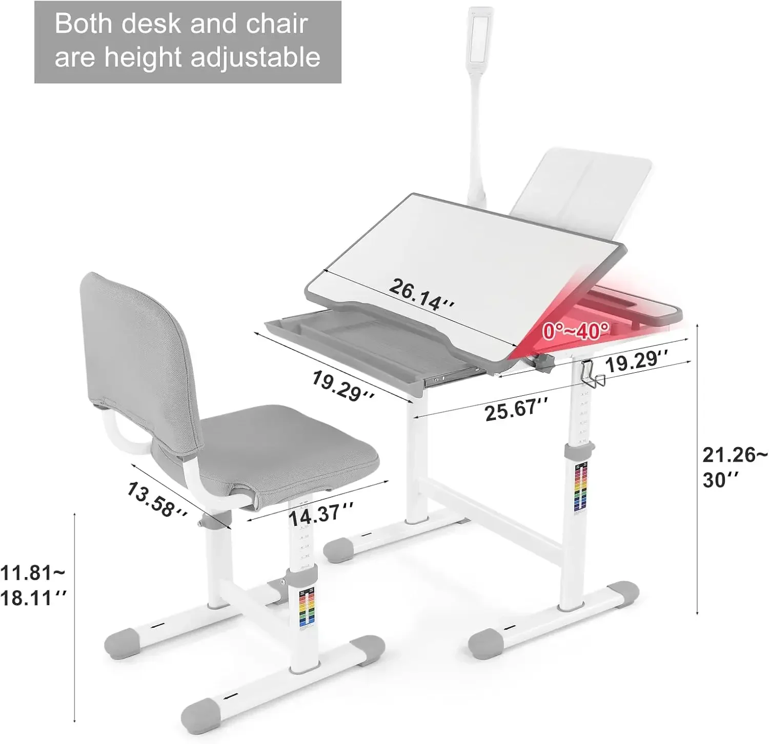 - Ergonomic tilting desktop and eye care lamp – Twist the side knobs to tilt the desktop from 0-40° for writing, reading, or drawing. The touch control LED desk lamp offers three brightness levels to help reduce eye strain and make evening study time more relaxing and fun.