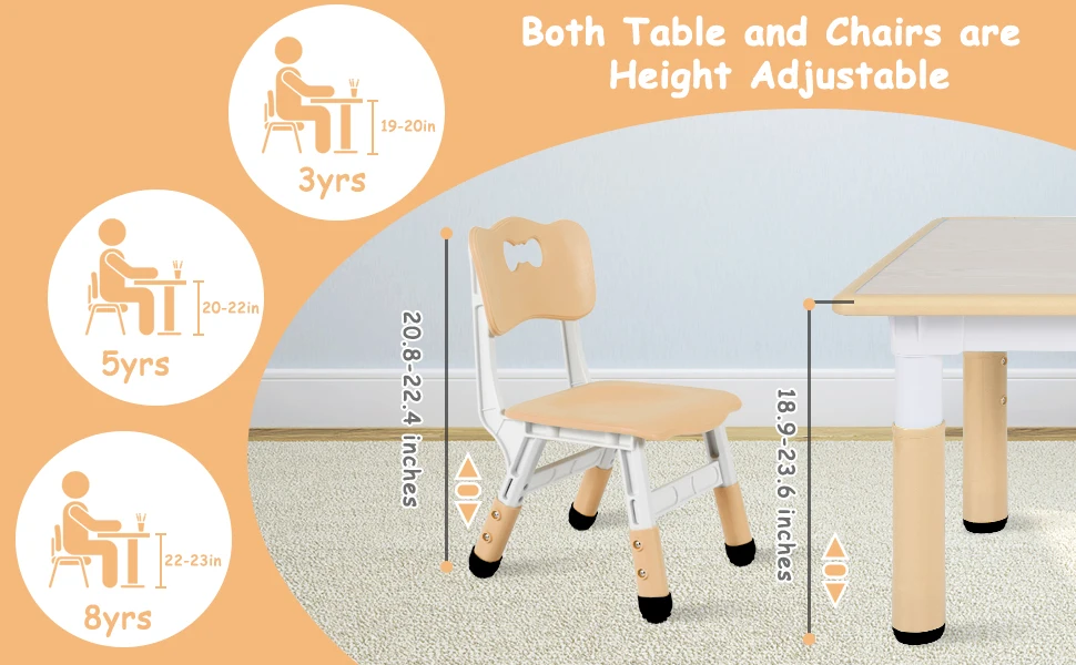 - Adjustable height for growing kids: The height-adjustable table and chairs are designed to fit children from about 2 to 10 years old. The table offers multiple height levels from approximately 18.9 in to 23.6 in, and each chair has 3 height positions from about 20.8 in to 22.4 in to support healthy posture as your child grows.