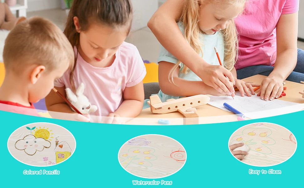- Spacious tabletop: The large desktop measures approximately 23.6 in x 23.6 in, providing enough space for about 4–6 children to play, draw, or study together. A raised lip around the edge helps prevent stationery and small items from rolling off, and the smooth surface wipes clean easily.