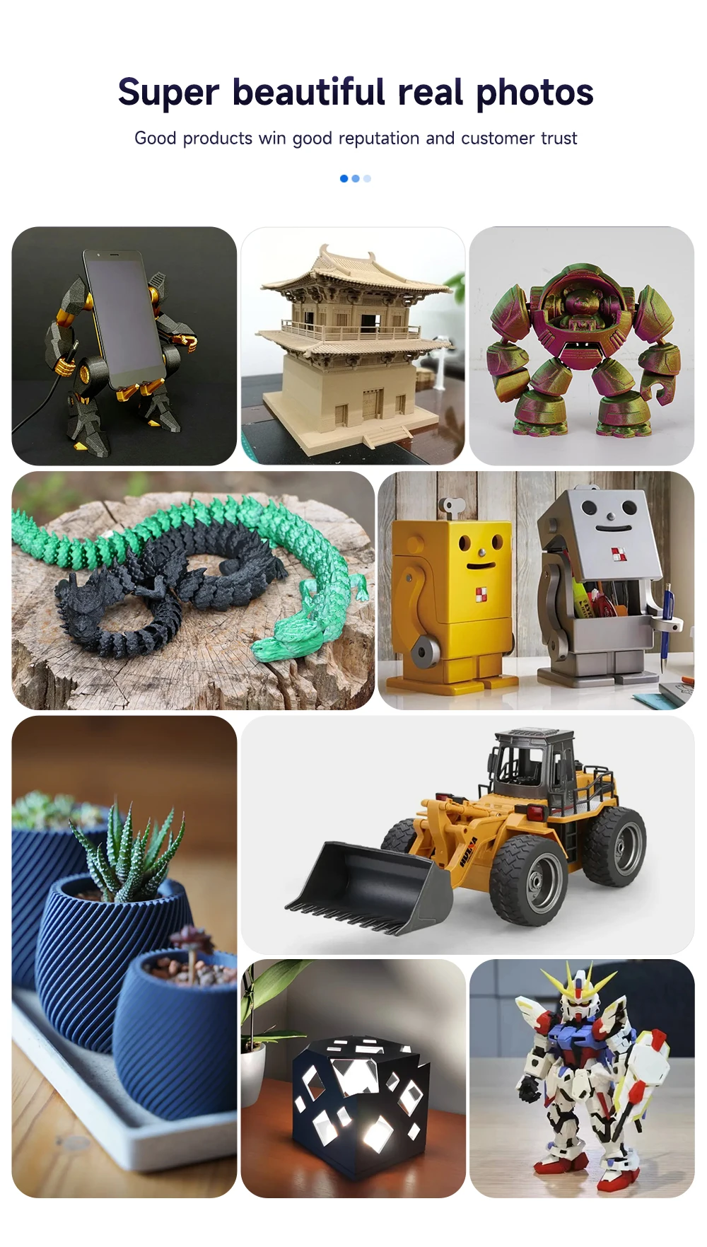 PLA, or Polylactic Acid, is a commonly used thermoplastic material that does not require the use of a heated print bed. Because of its lower melting temperatures and lack of warping, PLA filaments retain their color vibrancy and are a common choice for displays or small household prints. The 3D printed object will have a glossy finish. We love it because it has less warping, is easy to use, and does not require a heated bed.