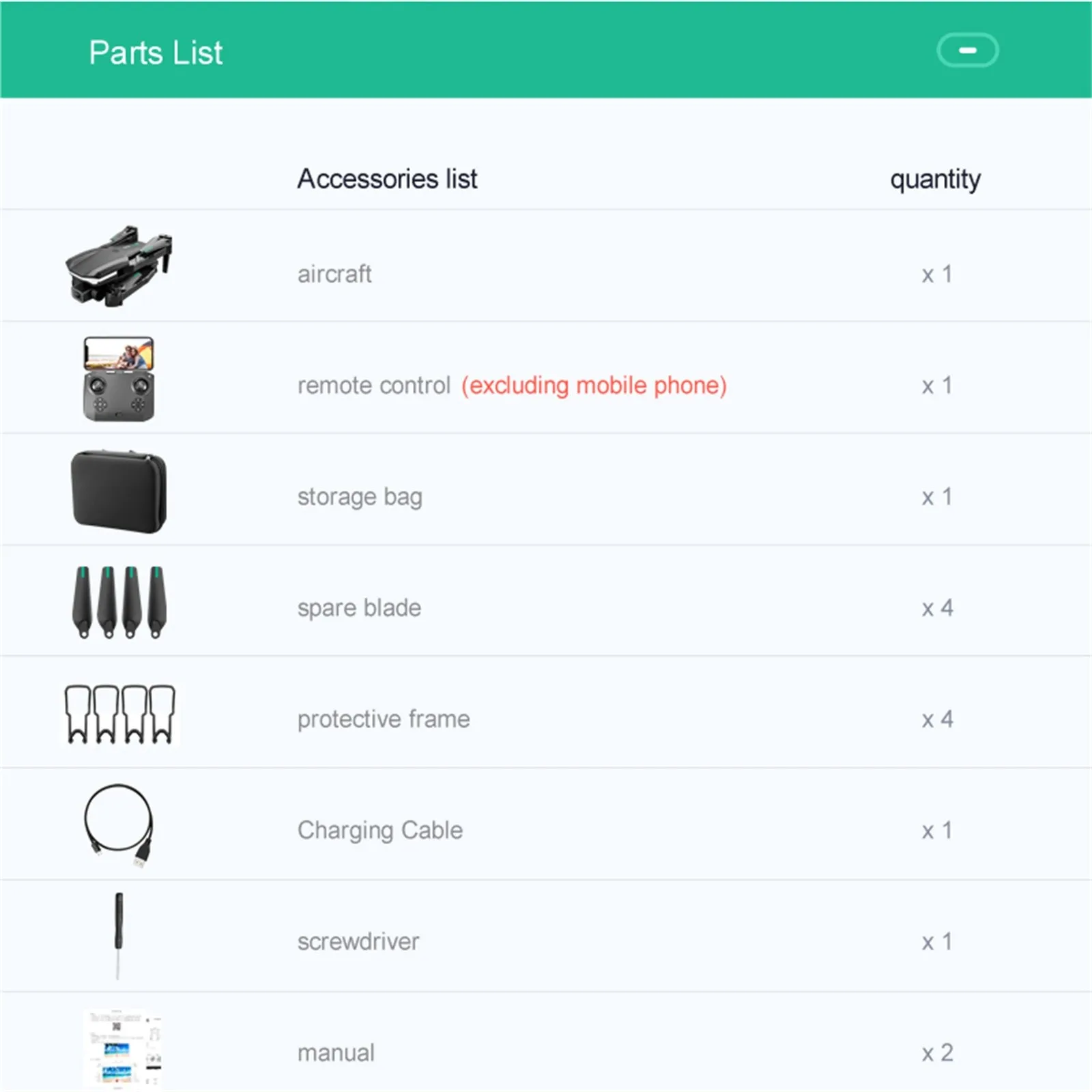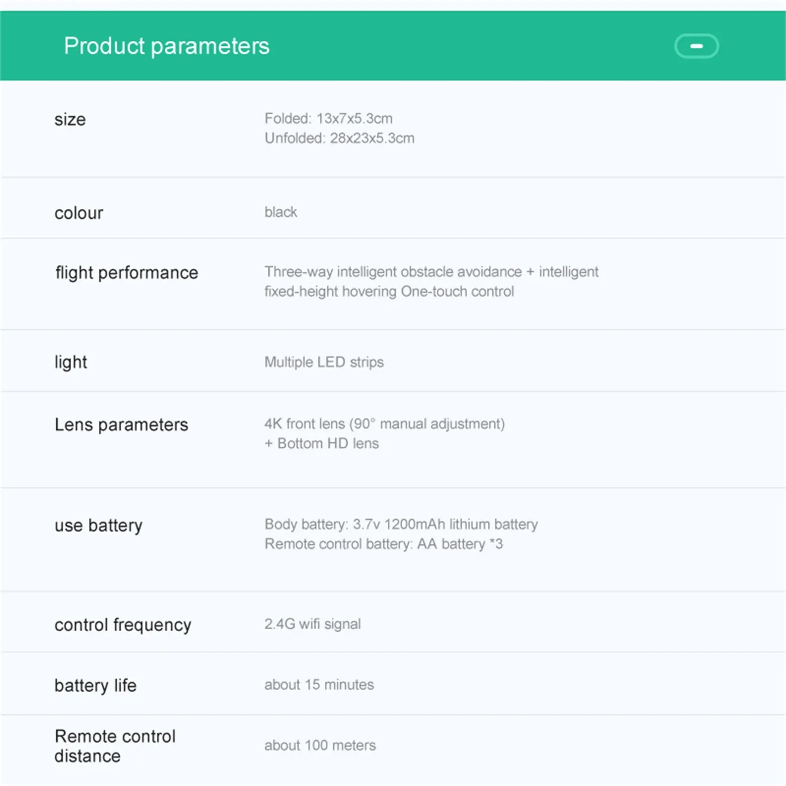 - Functions: Up/Down, Forward/Back, Left/Right Turn, Side Flight, LED Light, Headless Mode, One-button Auto Return, Altitude Hold Mode, WiFi FPV