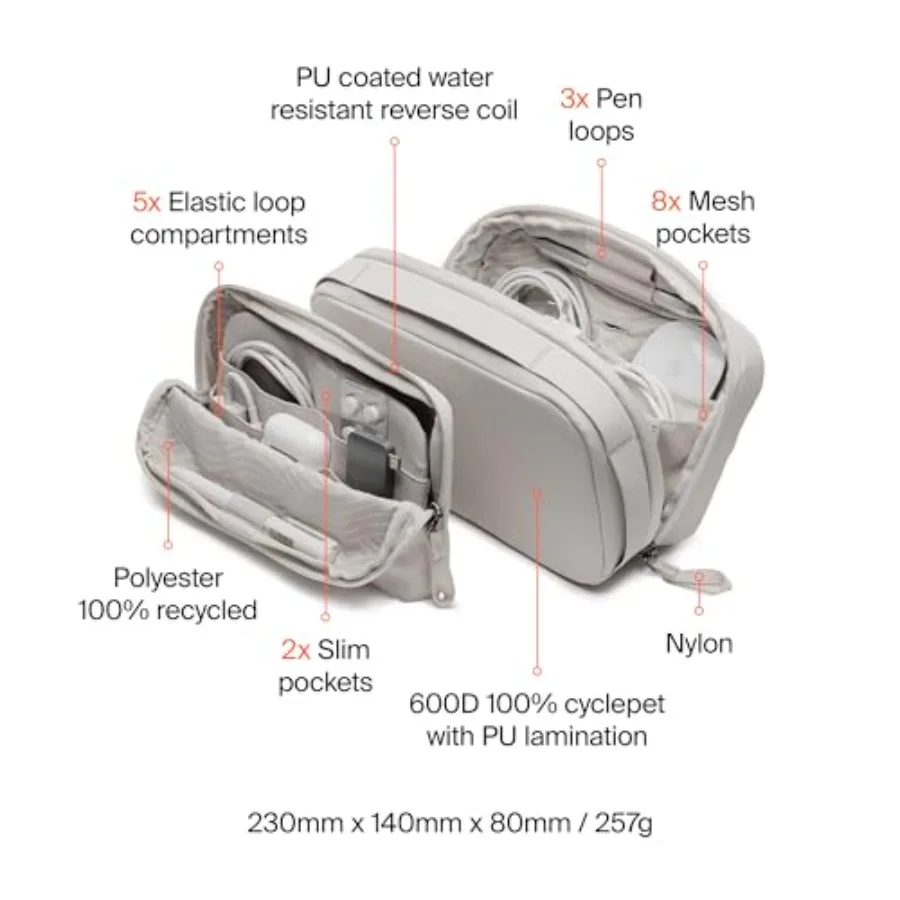 Based on the product images, this organizer includes 5 elastic loop compartments, 3 pen loops, 8 mesh pockets, and 2 slim pockets for better item separation. The materials shown include polyester made from 100% recycled material, 600D 100% cyclepet with PU lamination, nylon details, and a PU-coated water-resistant reverse coil. The listed size is 230mm x 140mm x 80mm, with an approximate weight of 257g, giving you a compact pouch with strong storage capacity.