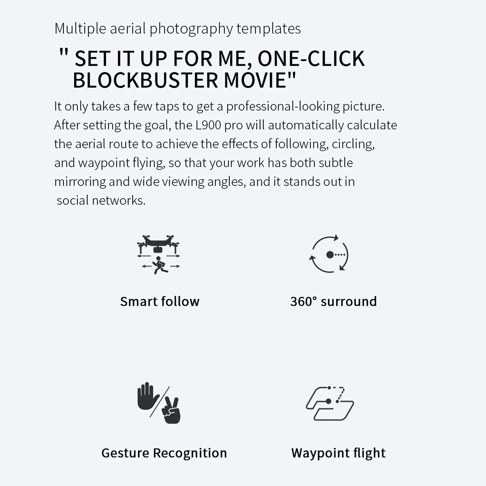 - Route Planning: Autonomously flies along a preset route, allowing the user to focus on capturing footage.