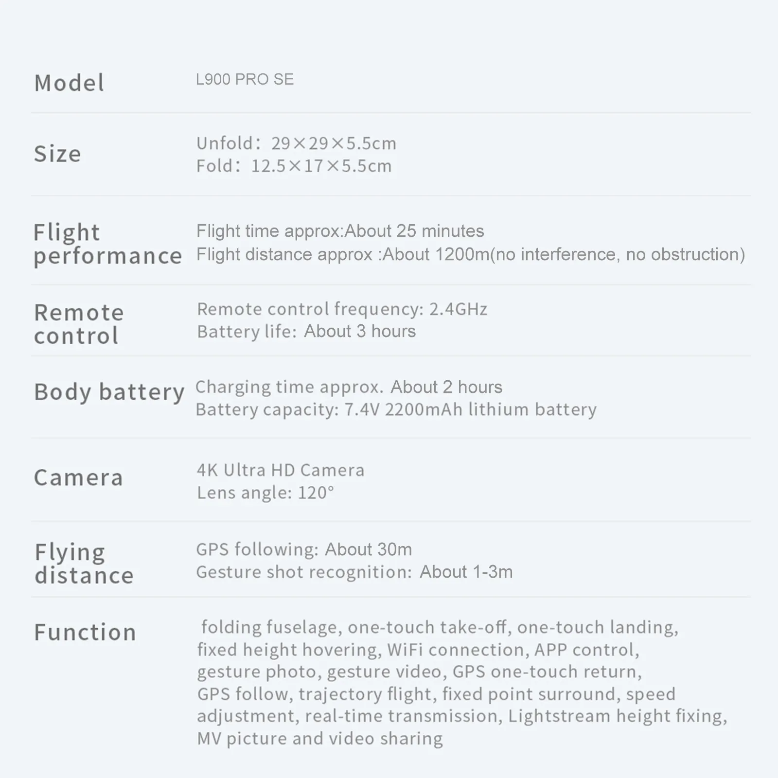 The L900 Pro SE 5G GPS 4K HD Camera FPV Drone with Brushless Motor is a professional quadcopter designed for high-quality aerial photography and videography. It comes with a single battery offering approximately 25 minutes of flight time and includes a storage bag for convenience. Below are the features and specifications of this drone:
