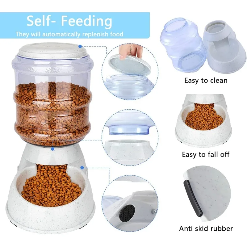 • Convenient Design: This automatic dog feeder features a gravity-fed system. Simply fill the bucket with food and snap it onto the base — the food will automatically refill the bowl. A must-have for pet owners due to its user-friendly design.