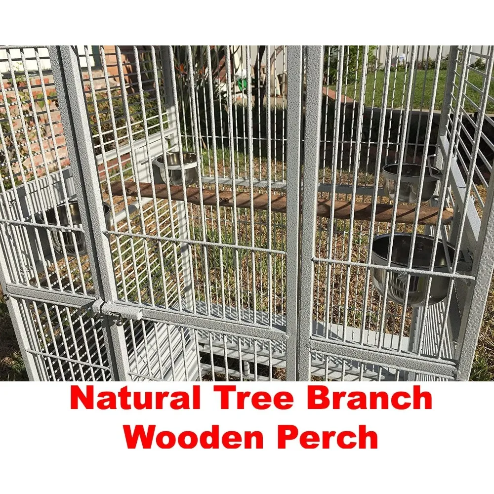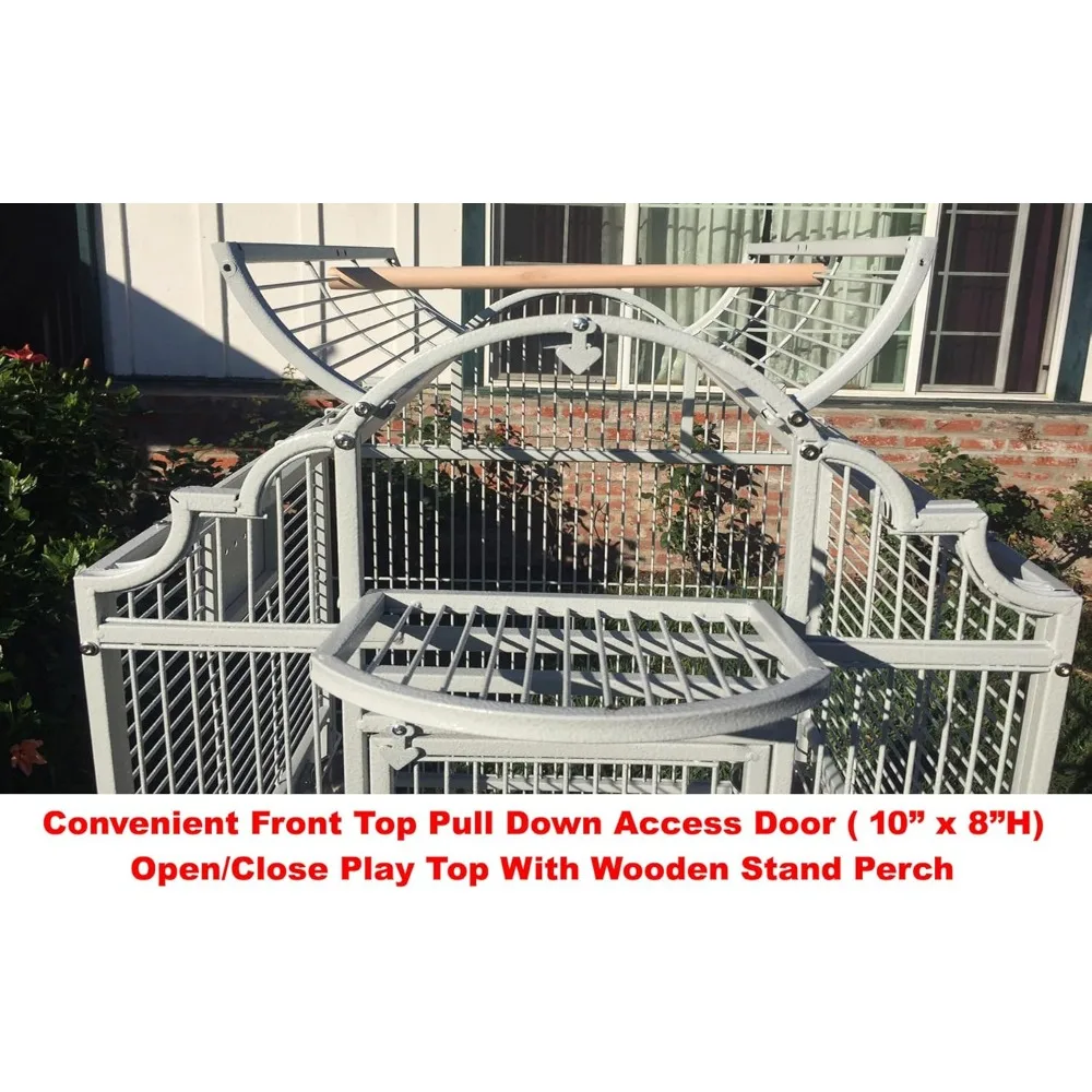 - Large Elegant Stylish and Durable Wrought Iron Parrot Cage – Non-toxic powder-coated finish, safe for birds. Features an open dome playtop area with a standing wooden perch.
