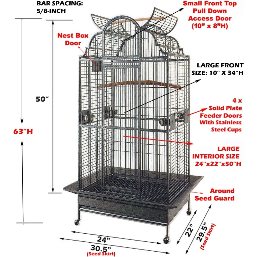 - Large Size – Overall Dimensions: 30.5”L x 29.5”W x 63”H (including stand, seed guard, and play top). Interior Cage Dimensions: 24″ x 22″ x 50″H.