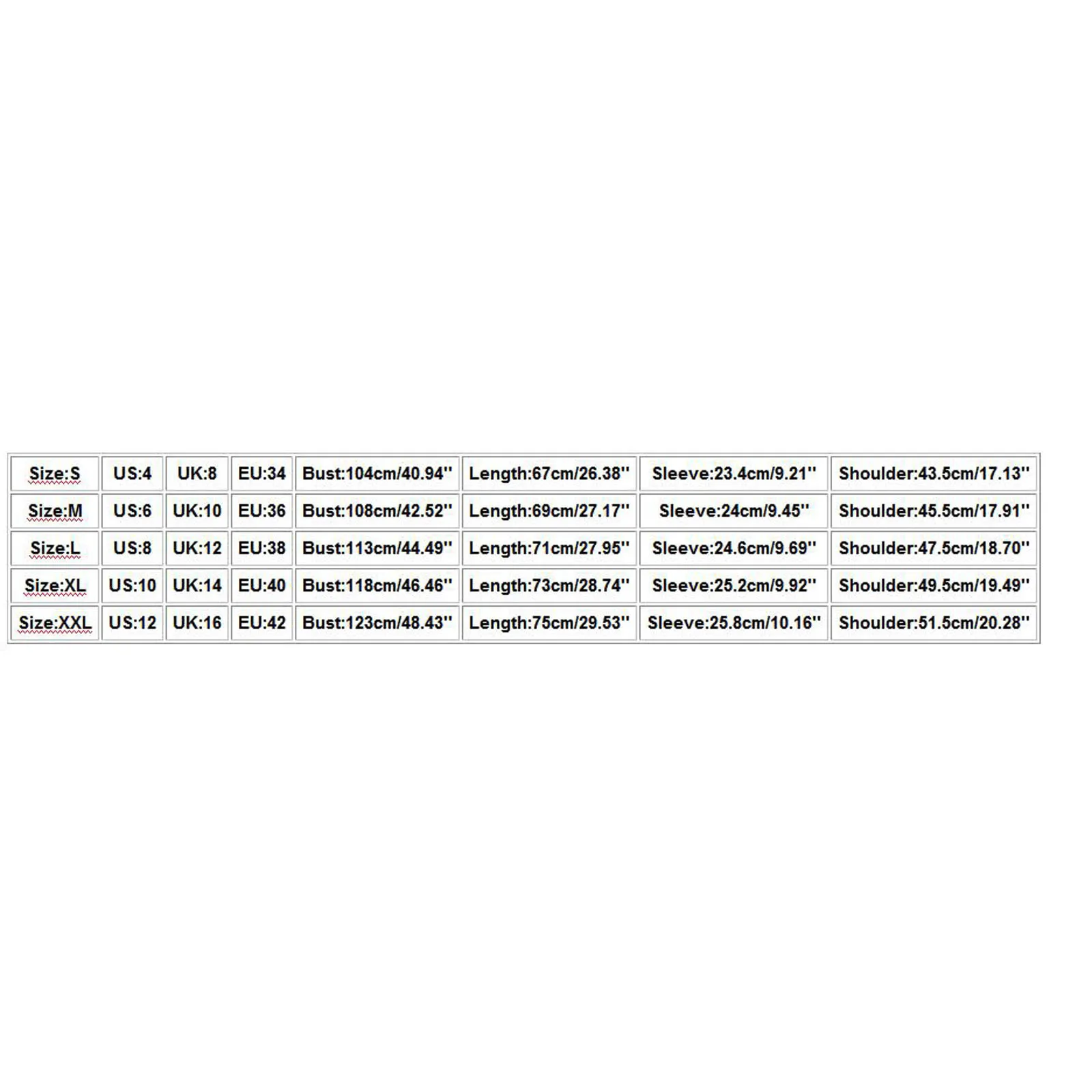 - XXL: US 12, UK 16, EU 42, Bust 123cm (48.43″), Length 75cm (29.53″), Sleeve 25.8cm (10.16″), Shoulder 51.5cm (20.28″)
