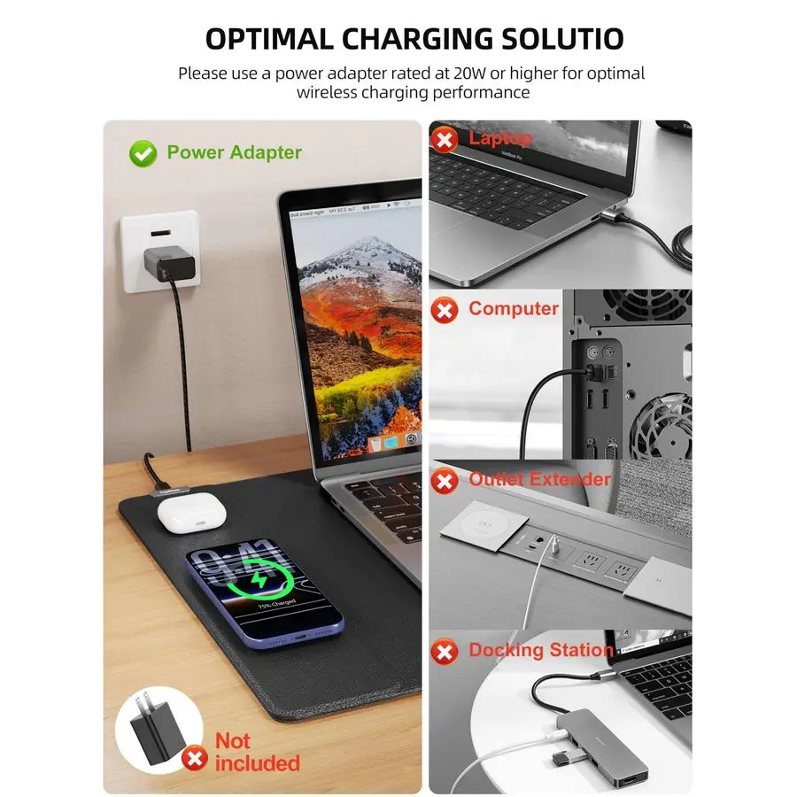 Use it as a mouse pad and desk mat while charging your phone and AirPods at the same time, without extra cables across your desk.
