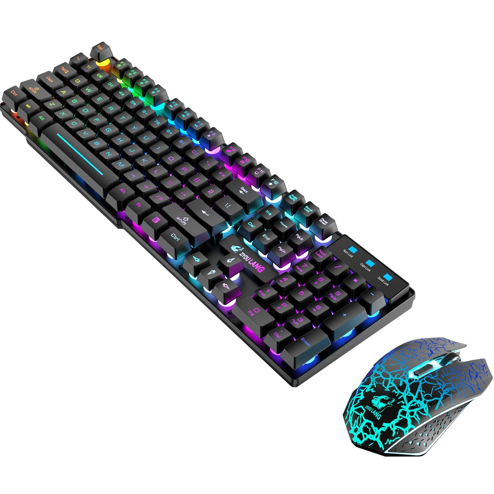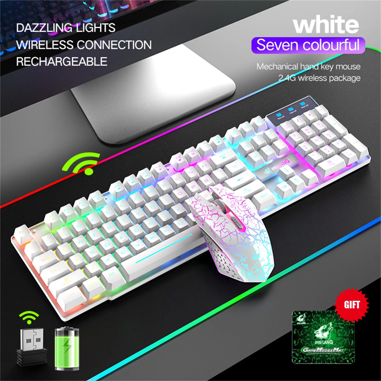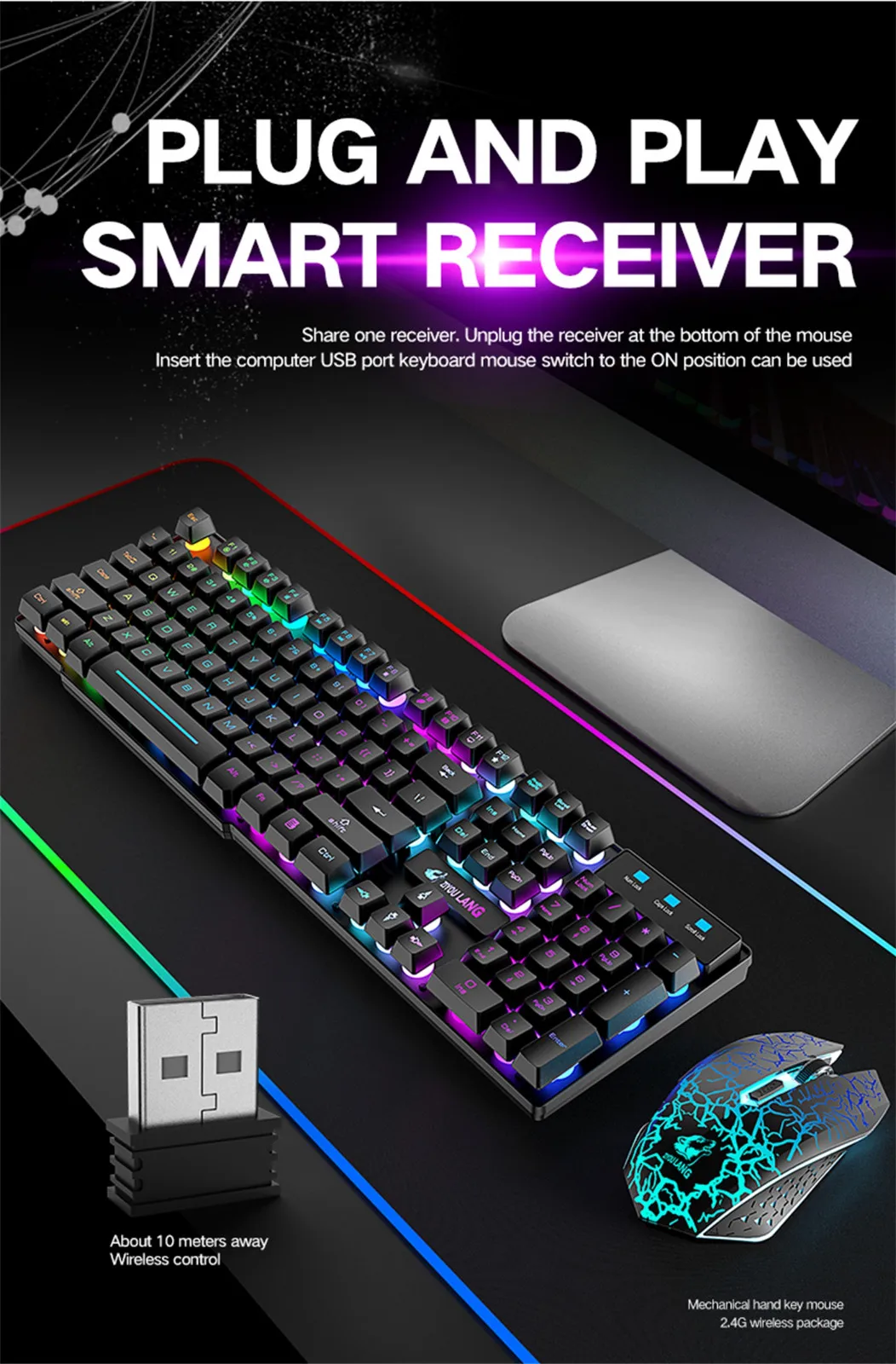2 in 1 Wireless Connection: Both the keyboard and mouse utilize a 2.4G wireless connection and share a single USB receiver, simplifying your setup and reducing desktop clutter. The colorful backlighting adds a mysterious atmosphere to your desktop.