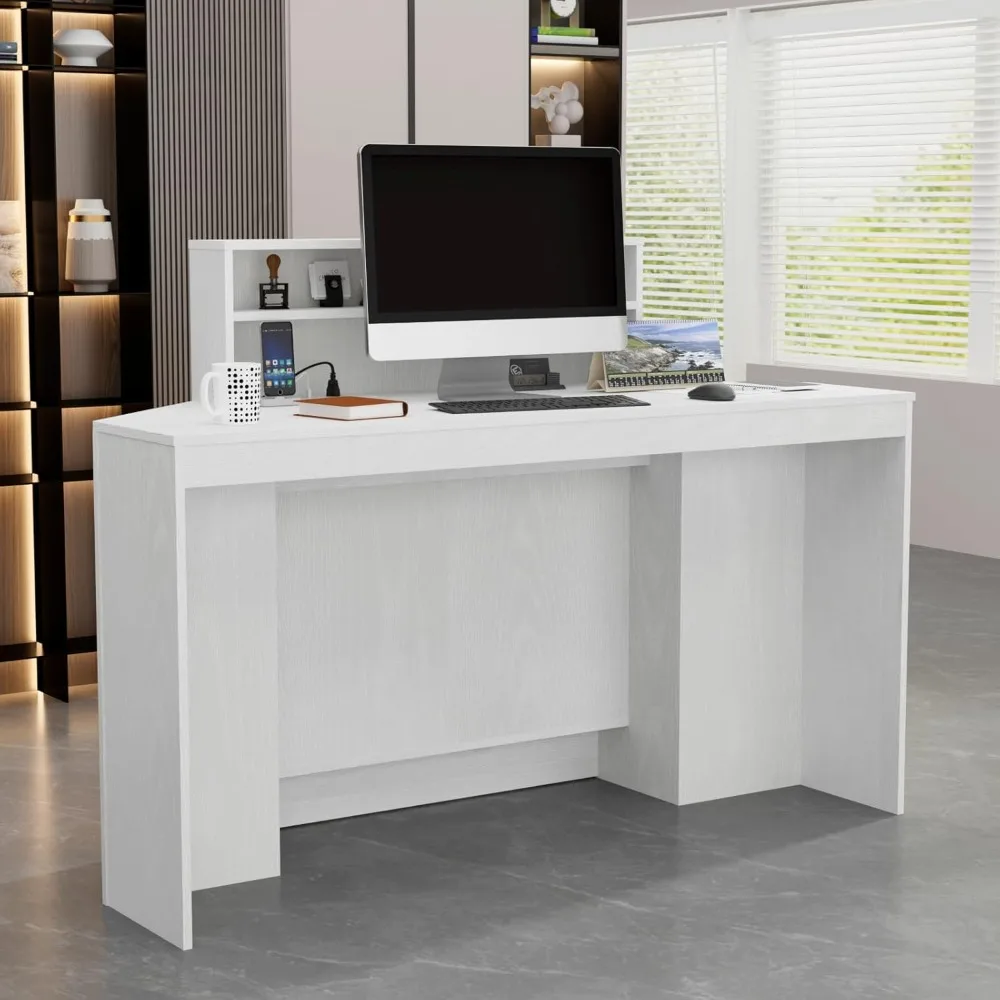 The reception desk is equipped with a power strip that includes two AC outlets and two USB ports for convenient charging of office essentials.