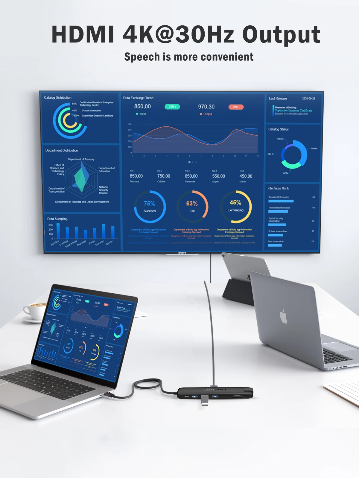 The USB-C multi-port adapter includes a 100W Type-C charging port. It supports high-power charging for laptops, tablets, smartphones, power banks, and more, with no need for an additional charger. Multiple devices can be charged simultaneously (input 100W, output approx. 85W). Even when fully loaded, it prevents your laptop from running out of power.