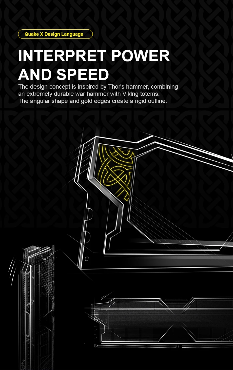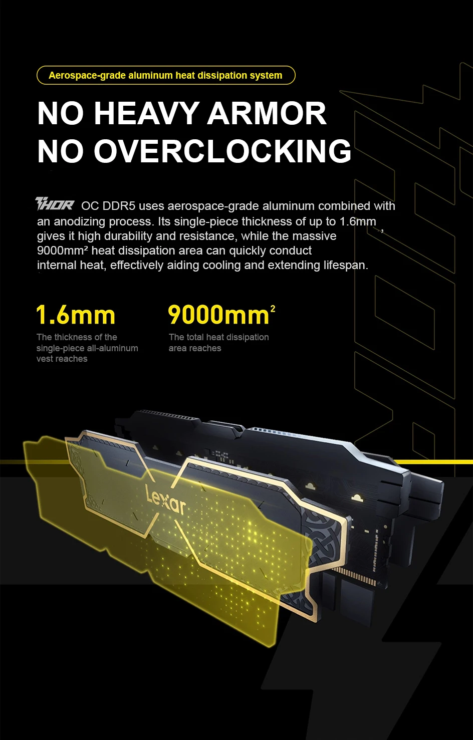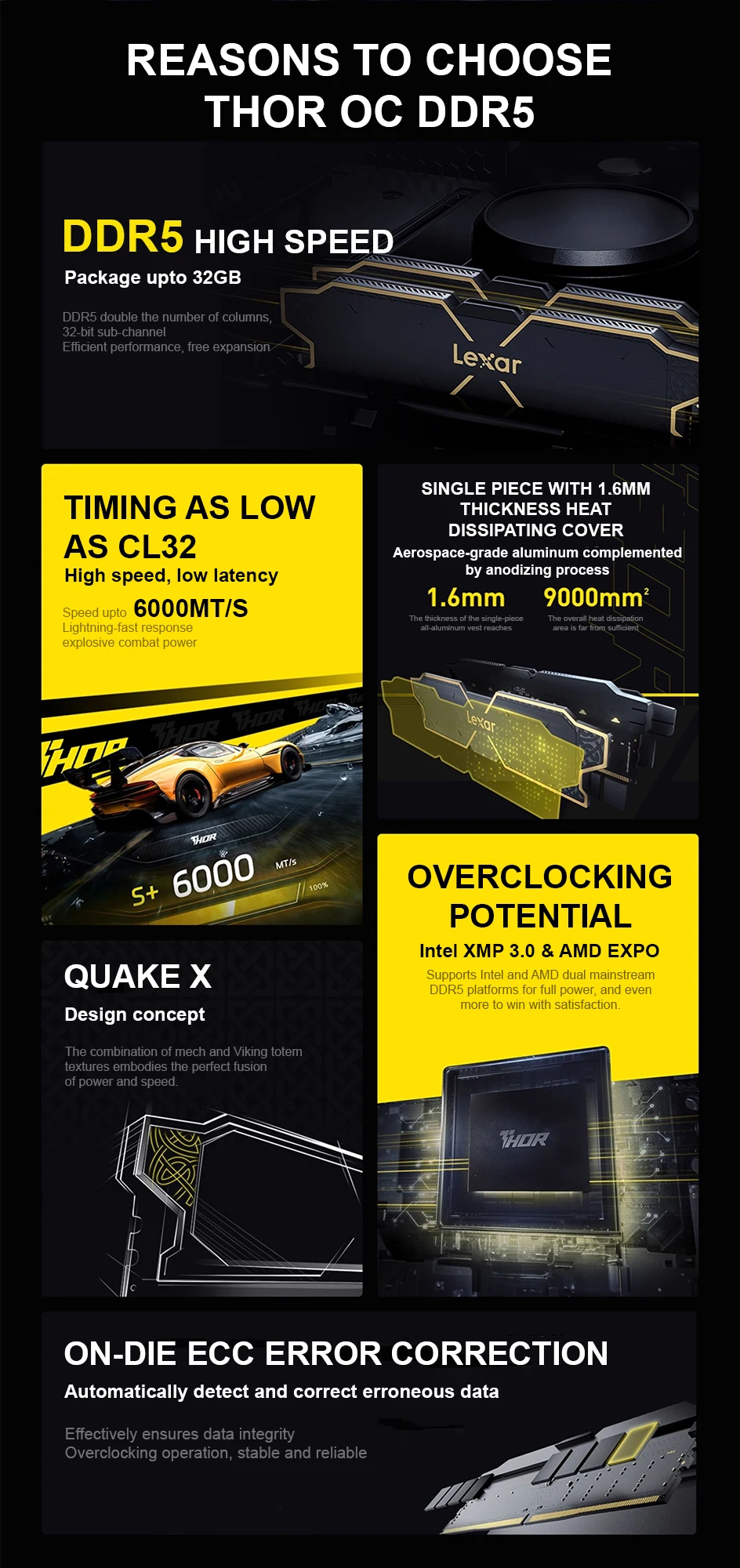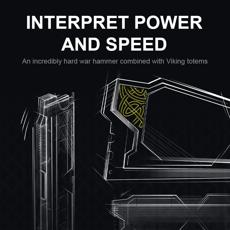 Cooling and stability are also key parts of this memory kit. The modules feature a single-piece 1.6mm aluminum heat dissipation cover with a listed 9000mm² heat dissipation area to help manage heat during operation. On-die ECC error correction is also shown to help support data integrity and system stability. The overall design is inspired by Thor’s hammer and Viking totem styling, giving the modules a bold and premium appearance inside a desktop build.