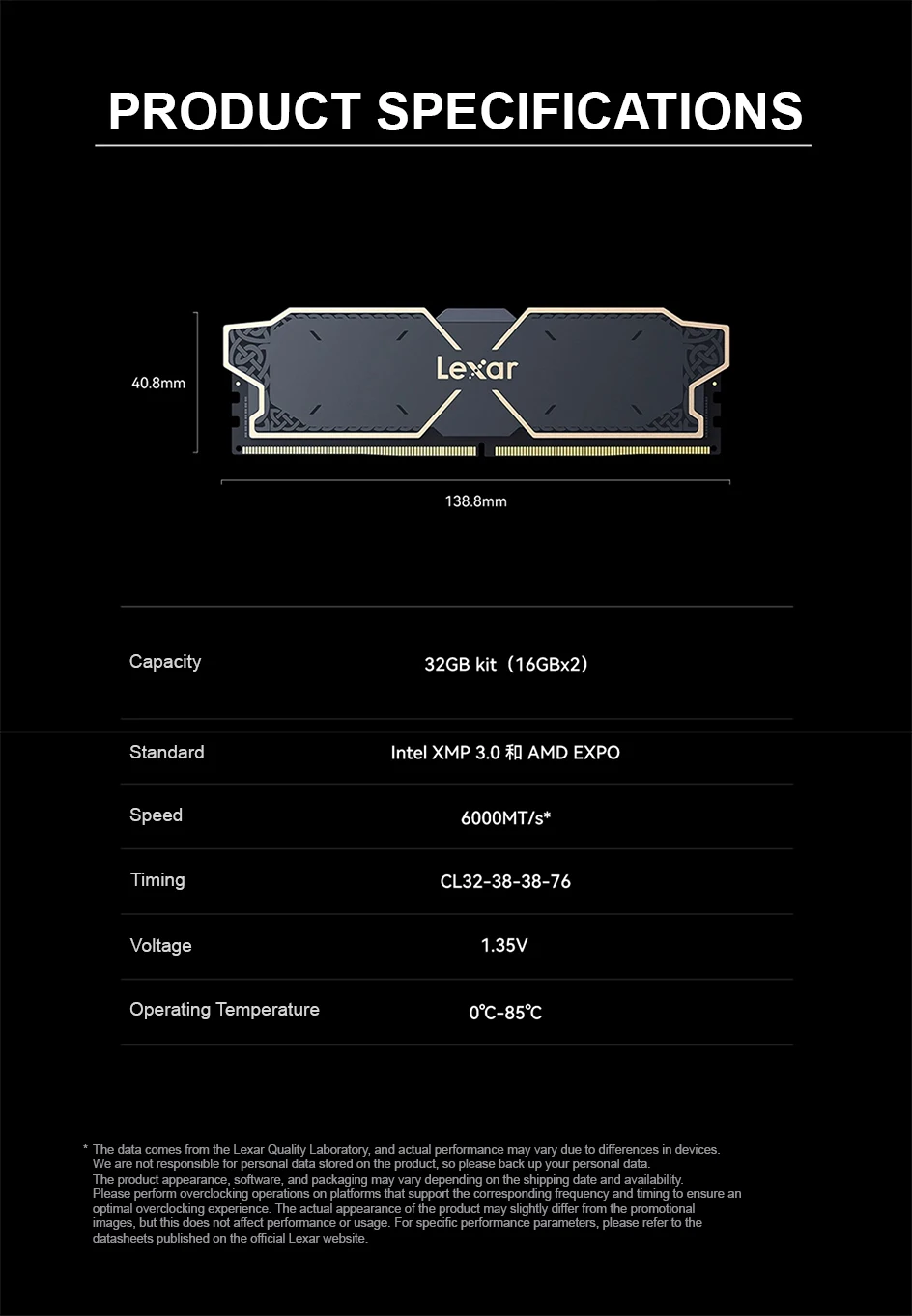 The specification details shown include module dimensions of 138.8mm x 40.8mm and an operating temperature range of 0°C to 85°C. With its balance of speed, cooling support, overclocking compatibility, and striking design, the Lexar THOR OC DDR5 32GB kit is a strong option for users building or upgrading a performance-focused desktop PC.