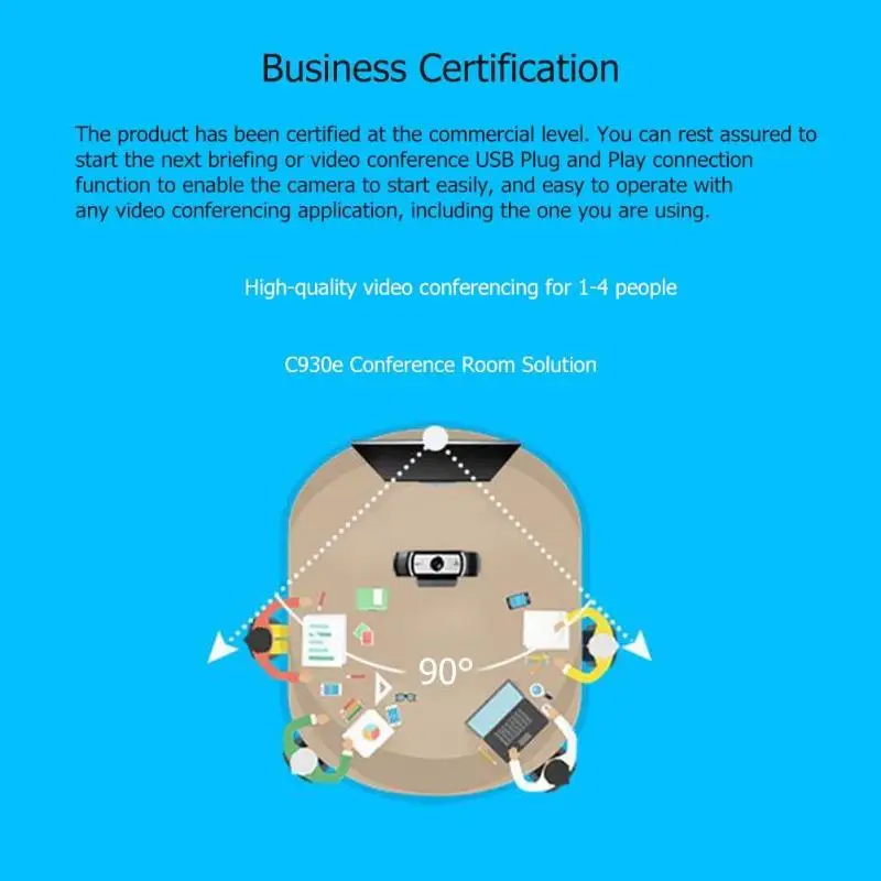 - Wide-angle view: With a 90-degree view, the C930c covers the entire team and whiteboard in the picture.