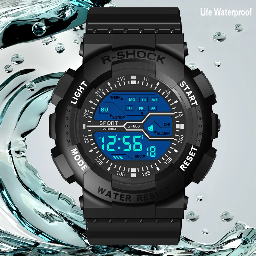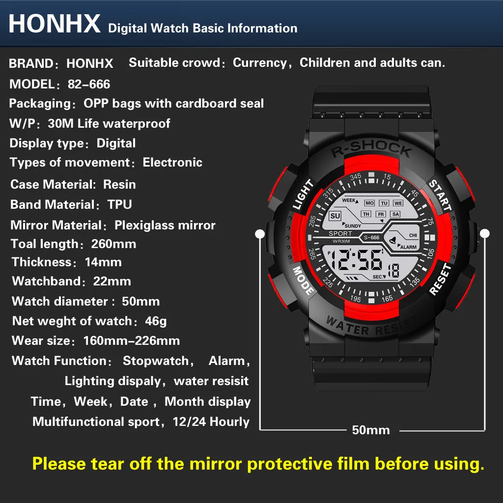 - Multi-function: Displays time, stopwatch, backlight, date, week, timing alarm clock, and waterproof features.