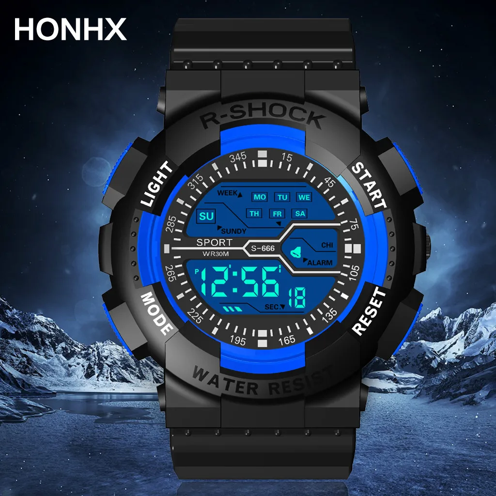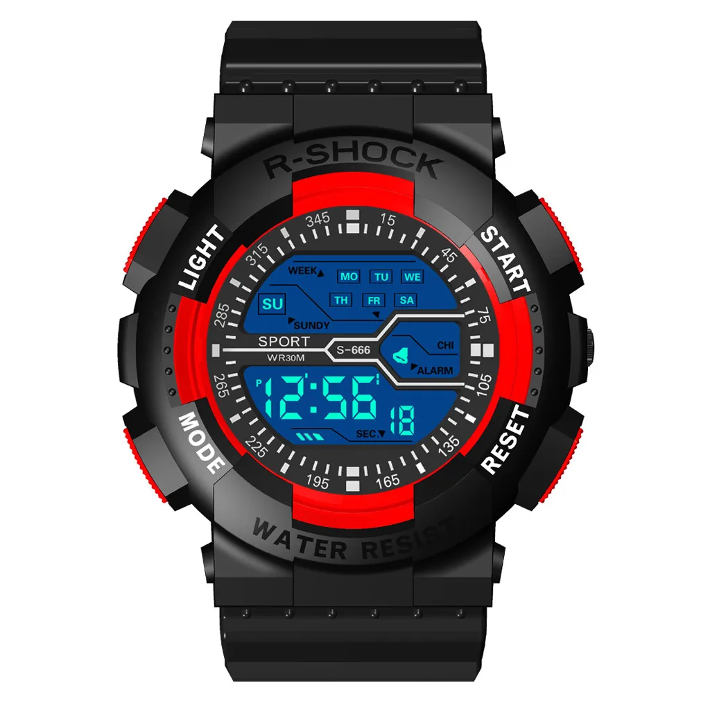 - Watch Functions: Stopwatch, Alarm, Lighting display, Water resistance, Time, Week, Date, Month display, Multifunctional sport, 12/24 Hour format.