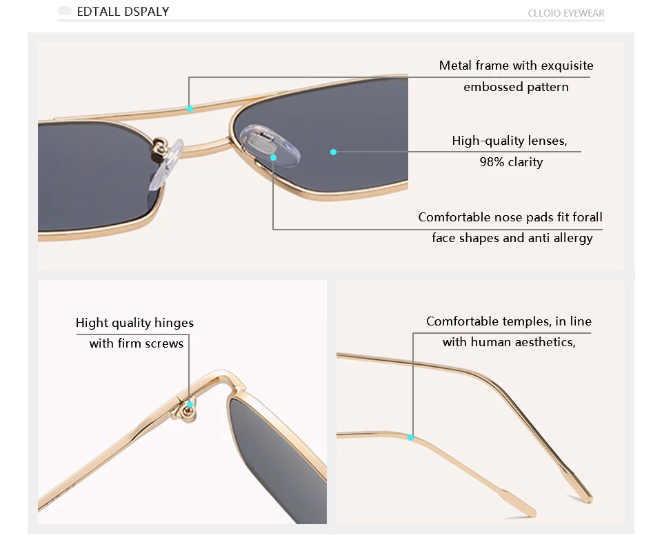 - Metal Thin Frame: Elegant metal thin legs wrapped in soft material for skin safety. Metal arms enhance stability, and polycarbonate lenses are lightweight.