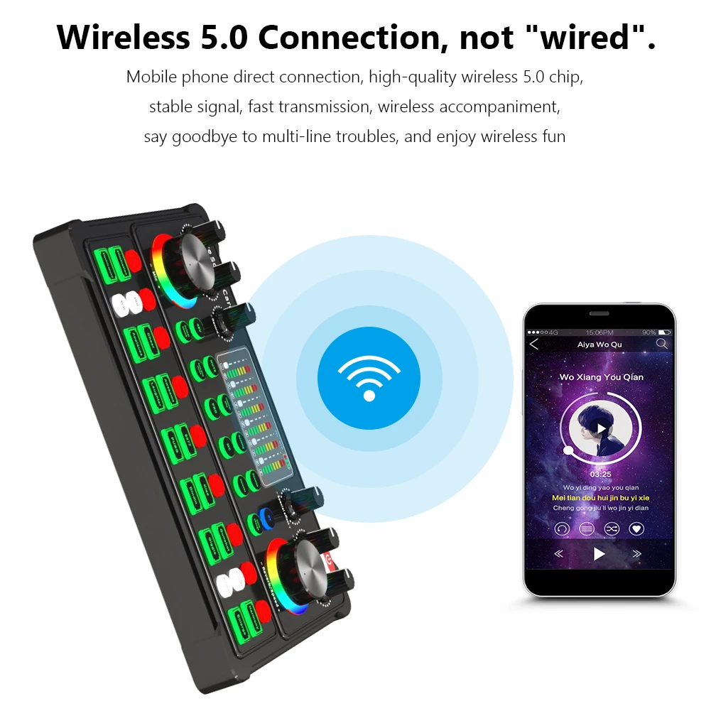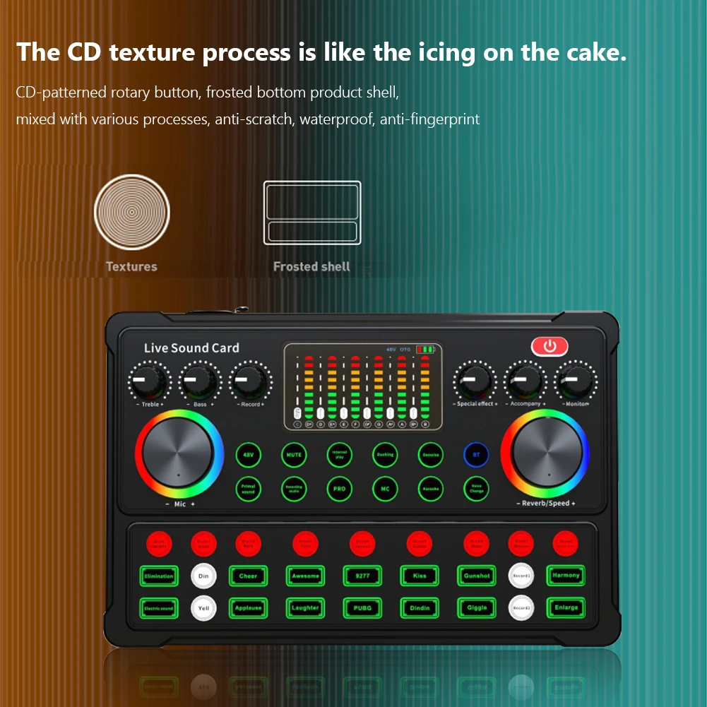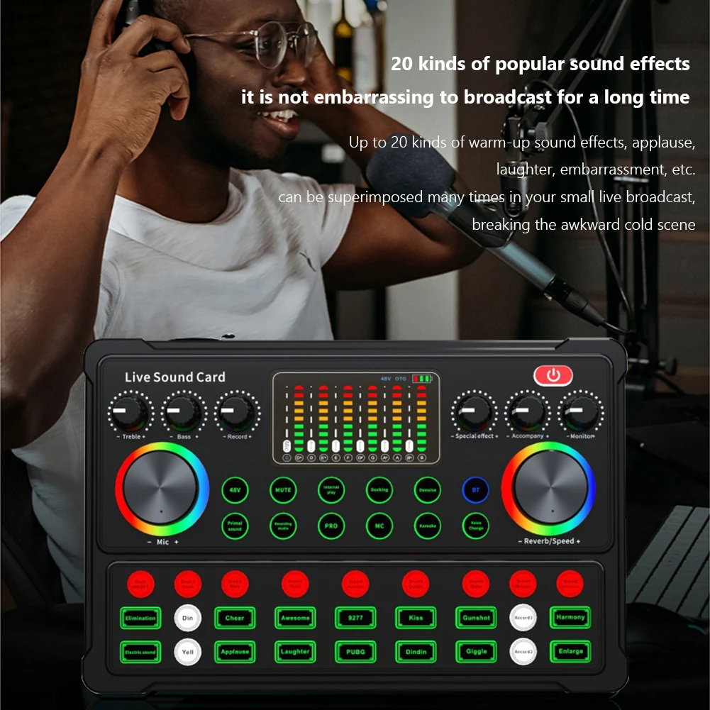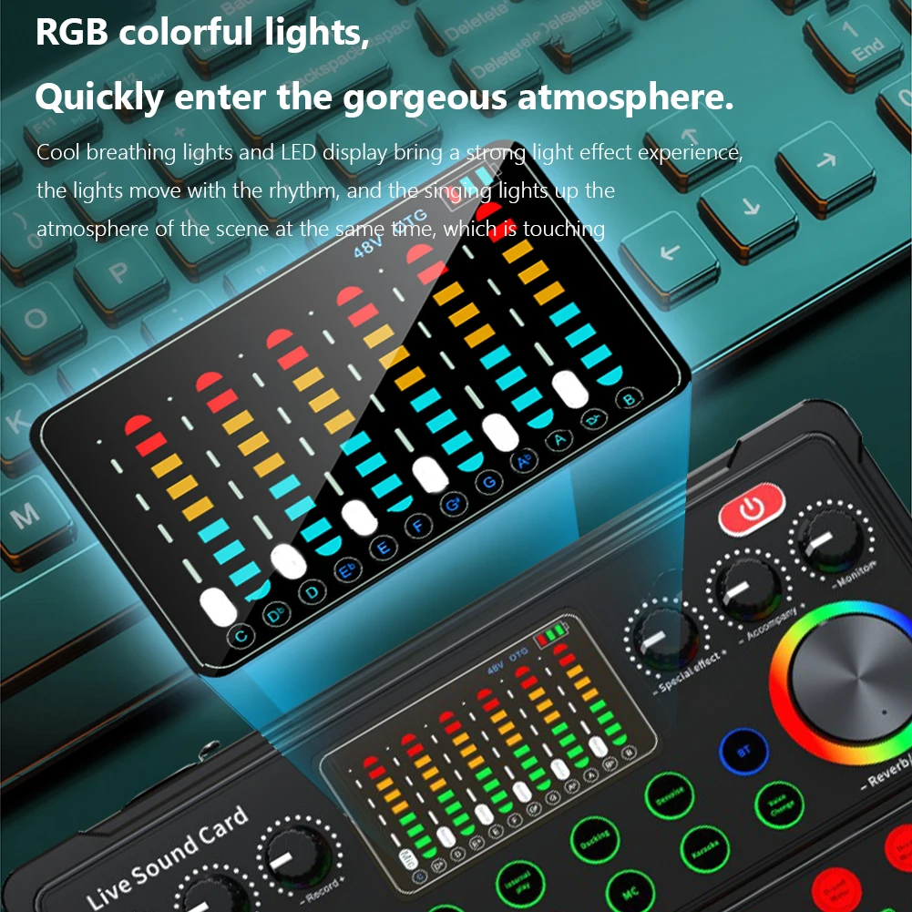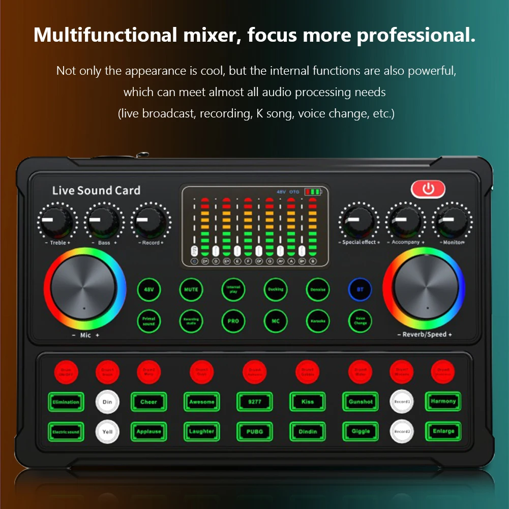 - Multi-Function Mixer: This sound card is not just about its cool appearance; it’s equipped with powerful internal functions. It’s a professional-grade mixer that caters to a variety of audio processing needs, including live broadcasting, recording, K songs, voice changing, and more.