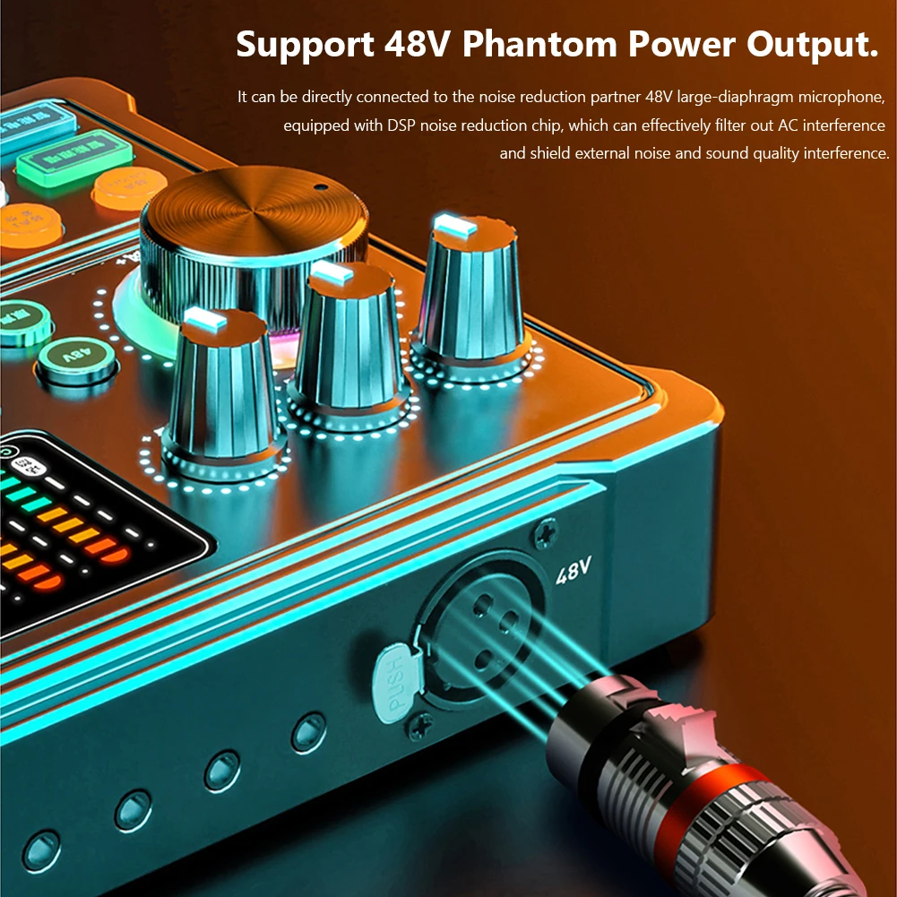- Support for 48V Phantom Power Output: Compatible with 48V large-diaphragm microphones, this sound card comes with a DSP noise reduction chip. It effectively filters out AC interference and shields against external noise and sound quality interference.