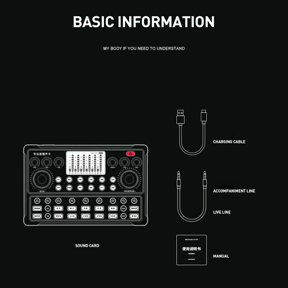 Product Description: This professional live sound card is designed to meet the diverse needs of users. It features a powerful DSP chip for upgraded functionalities like one-key dodge, noise reduction (small/large), smart sing-along, electronic music, harmony, drum kit, recording, mic gain, and more. Whether for live gaming or karaoke, this sound card offers versatile capabilities.