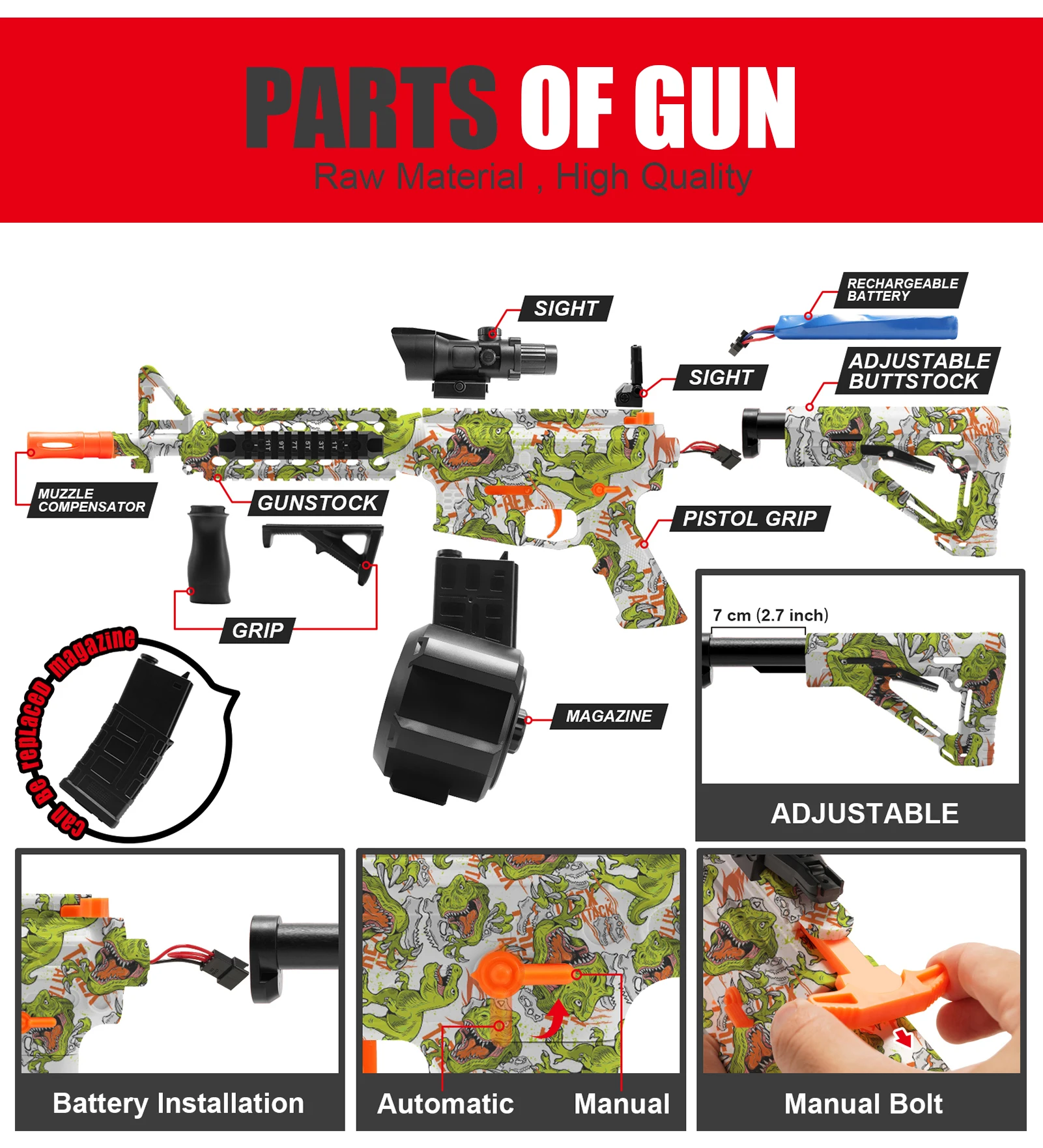 - Unique Dinosaur Camo & M4A1 Design: Make a bold statement with the blaster’s distinctive white, green, and orange camouflage featuring playful dinosaur and monster graphics. This eye-catching M4A1-style design is complemented by modular attachments like a functional scope for improved aiming, an adjustable buttstock for comfort, and a muzzle compensator.