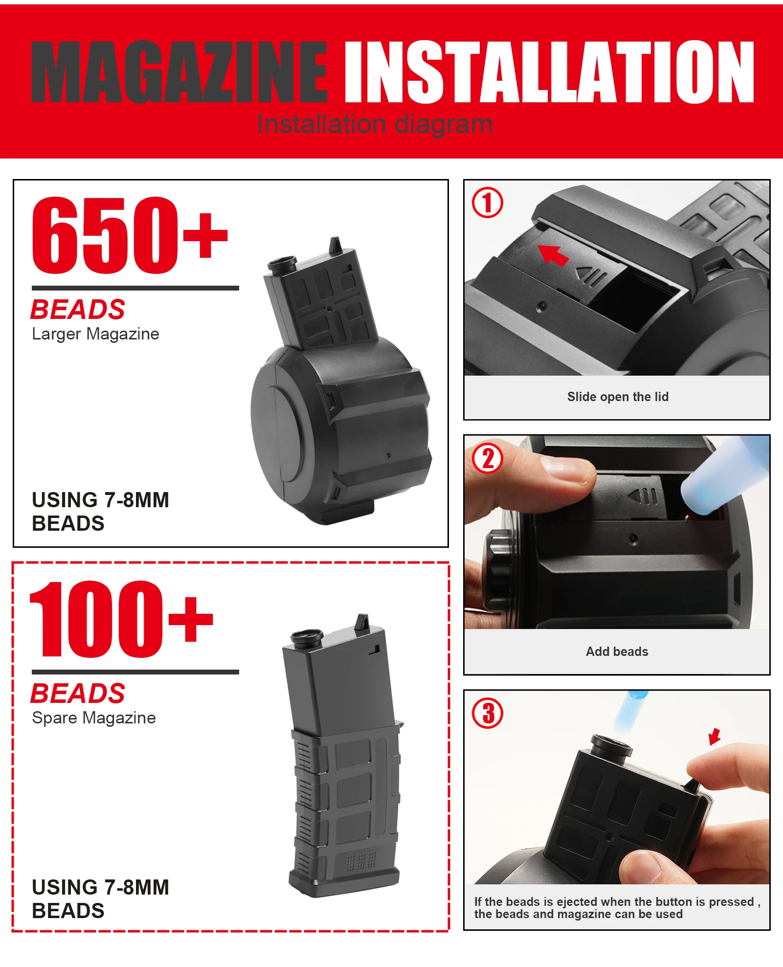 - High Capacity & Ammunition Versatility: Stay in the fight longer with our massive 650+ bead drum magazine, ensuring extensive continuous play. A convenient 100+ bead spare stick magazine is also included. Both use standard 7-8mm gel beads, providing ample ammunition for prolonged fun.
