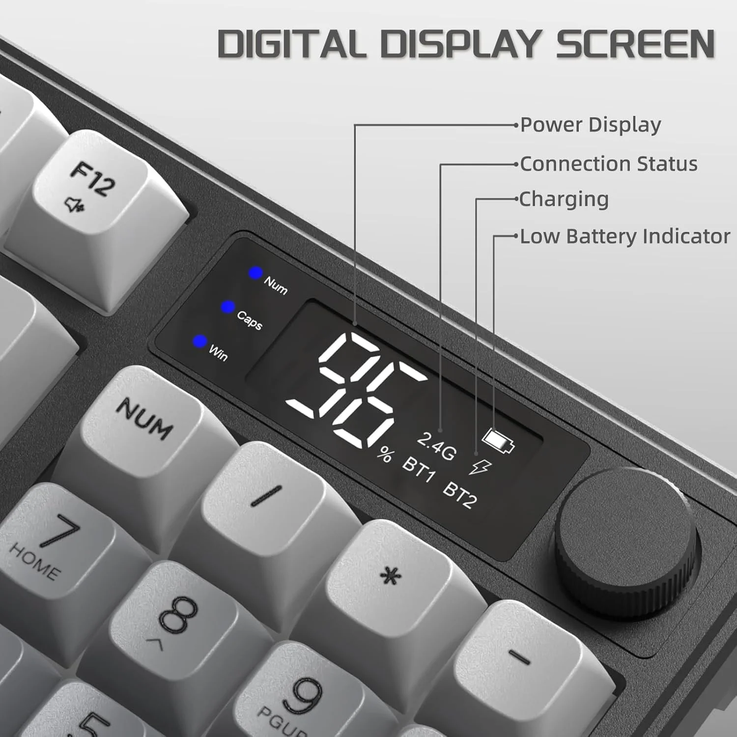 94-Key Membrane Keyboard with Smart Display and Volume Knob – The FREEWOLF M96 uses a compact 94-key ANSI layout that retains the right-side number pad and offset arrow keys, preserving full functionality while saving space. It includes an LCD smart screen to show keyboard status and a media roller to adjust volume. The crater structure provides soft, quiet clicks for a comfortable typing experience.