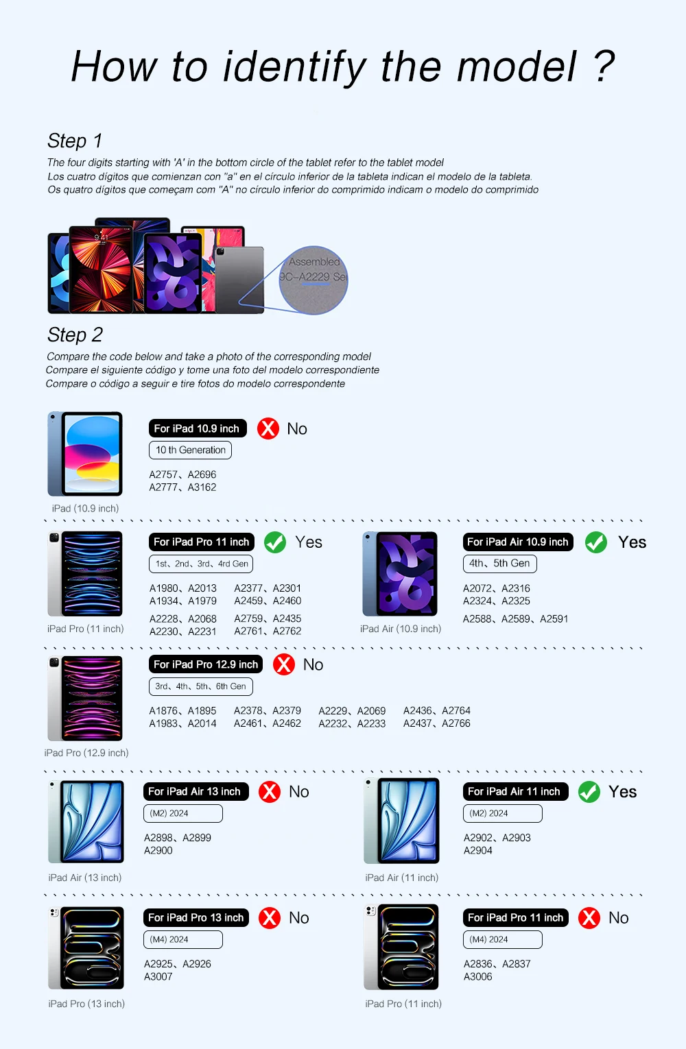- iPad Air 10.9-inch: Air 4 (2020) — A2324, A2325, A2072, A2136; Air 5 (2022) — A2589, A2591