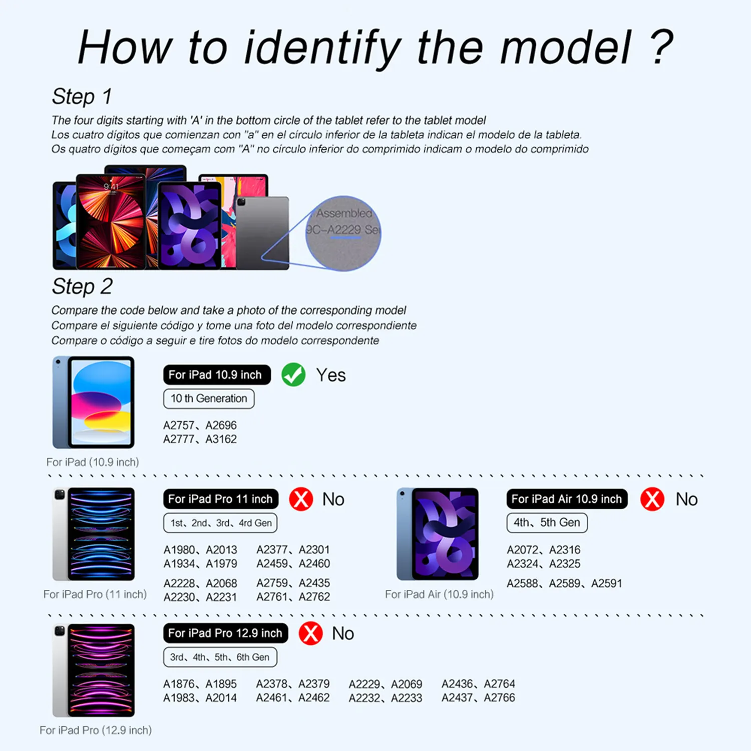 - iPad 10th Generation 10.9-inch (2022): A2696, A2757, A2777