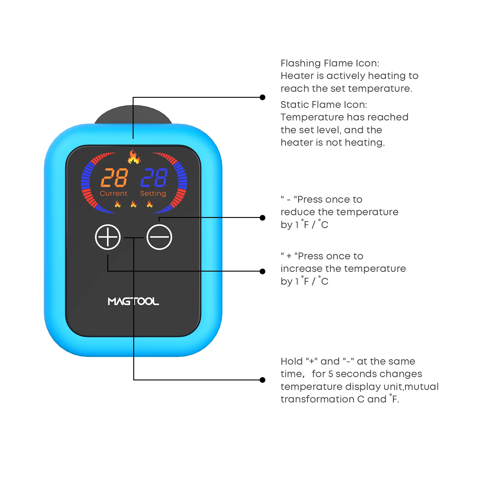 Flashing Flame Icon: Heater is actively heating to reach the set temperature. Static Flame Icon: Temperature is reached, and the heater stops heating.