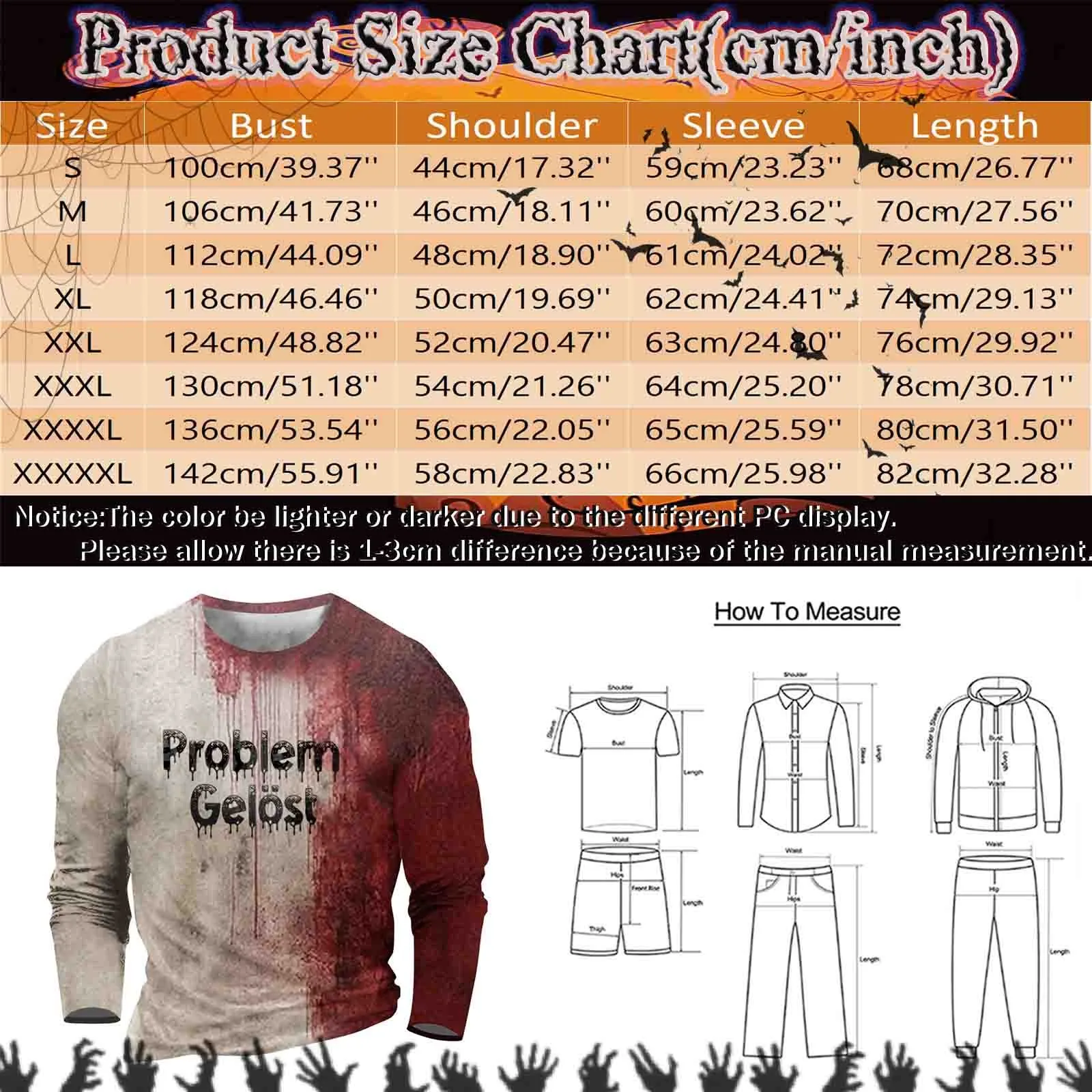 - XXXXXL: Bust: 142cm/55.91”, Shoulder: 58cm/22.83”, Sleeve: 66cm/25.98”, Length: 82cm/32.28”