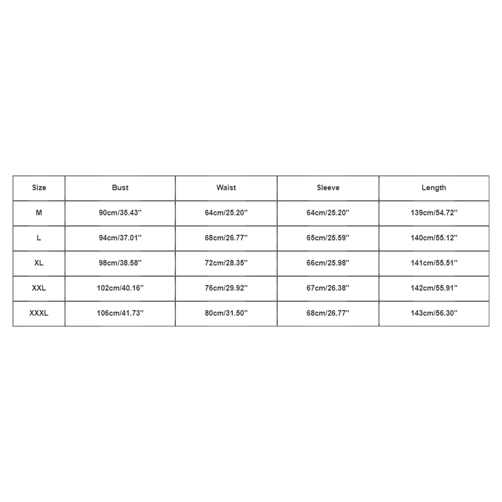 - XXL – Bust: 102 cm / 40.16″, Waist: 76 cm / 29.92″, Sleeve: 67 cm / 26.38″, Length: 142 cm / 55.91″
