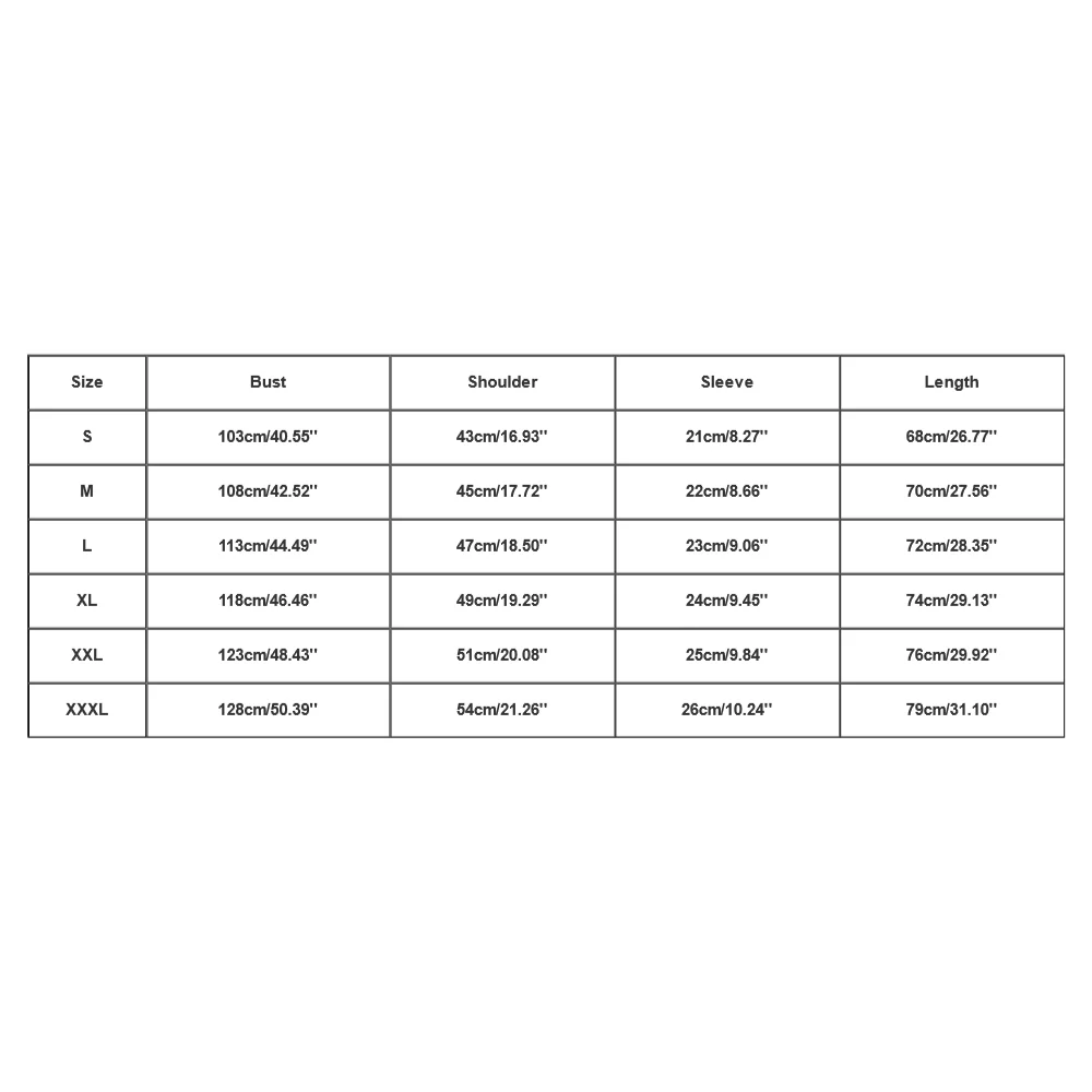 - XXXL: Bust 128cm/50.39″, Shoulder 54cm/21.26″, Sleeve 26cm/10.24″, Length 79cm/31.10″