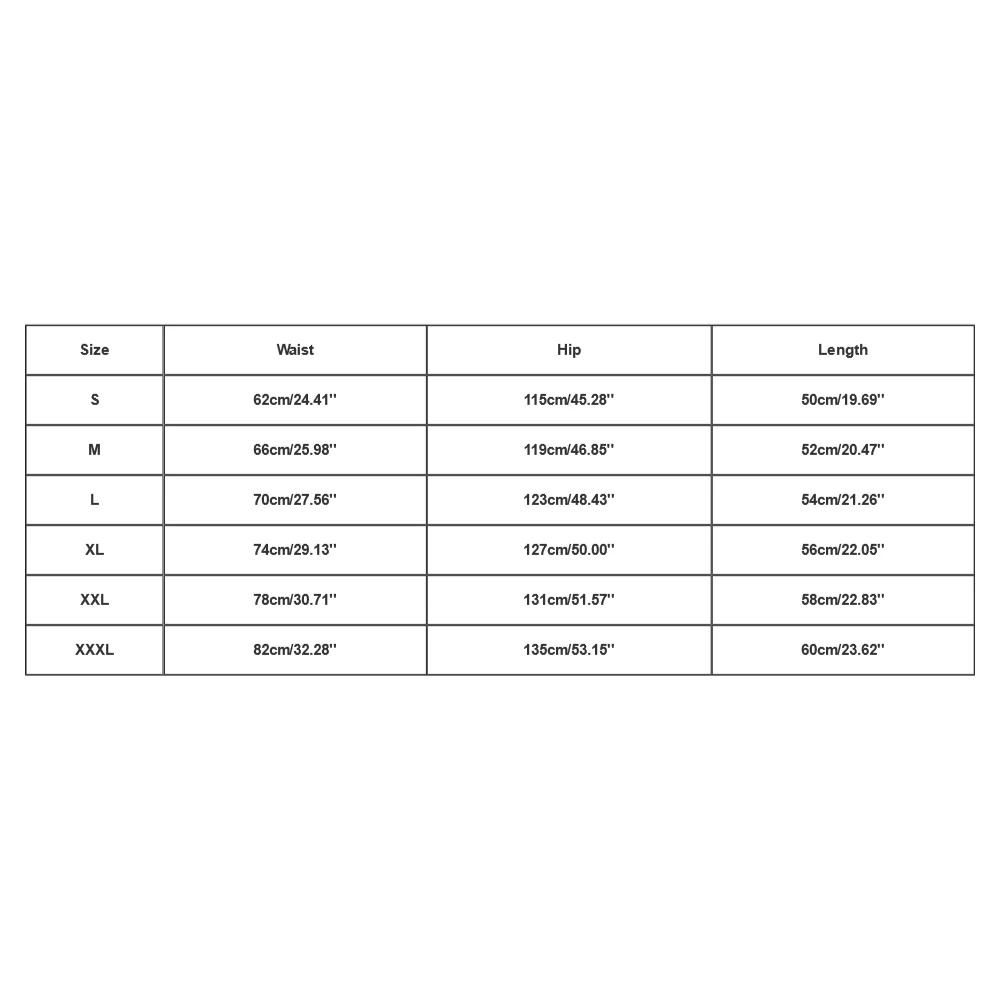 XXL – Waist: 78cm / 30.71″ Â Hip: 131cm / 51.57″ Â Length: 58cm / 22.83″
