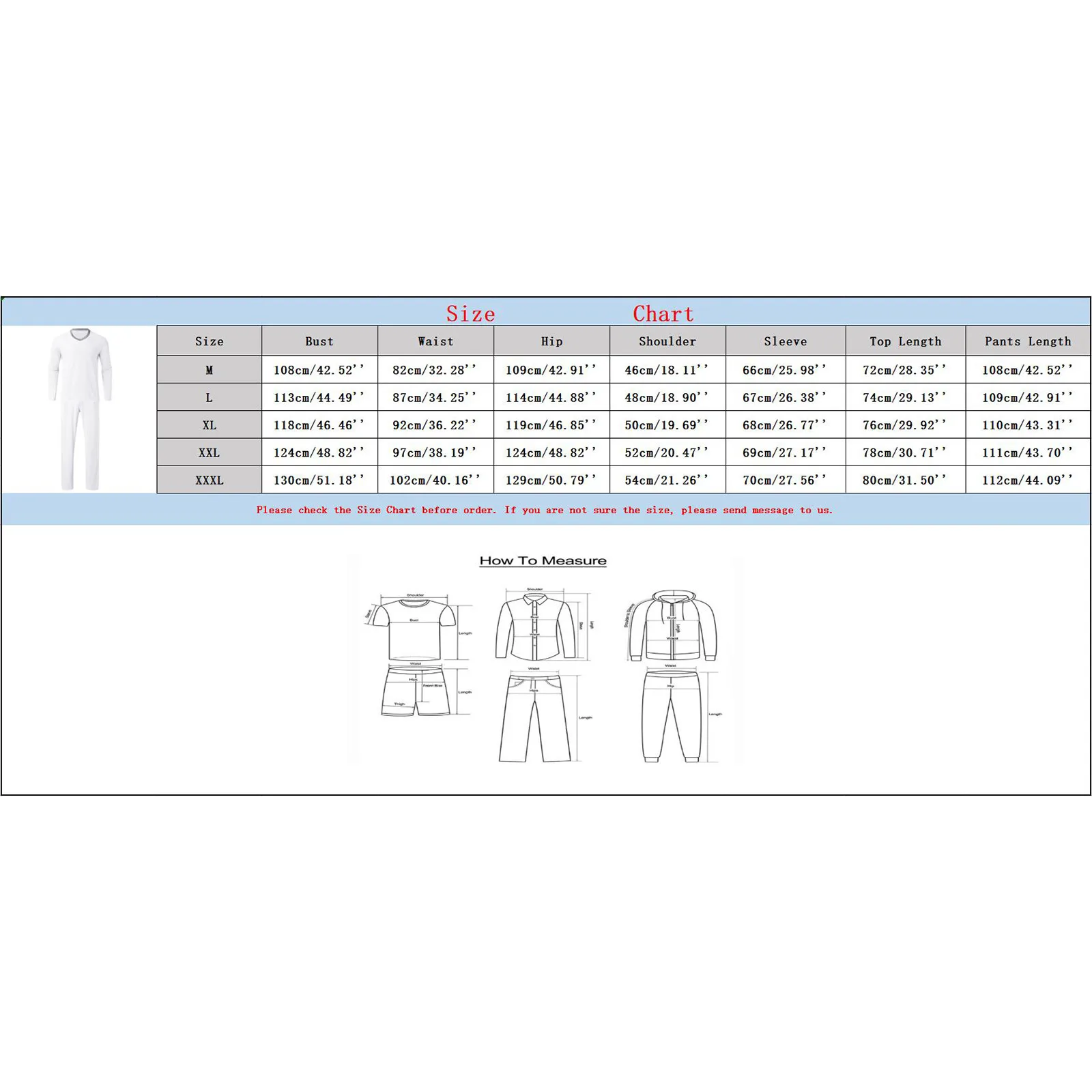 - XX-Large (XXL): Bust – 124cm/48.82”, Waist – 97cm/38.19”, Hip – 124cm/48.82”, Shoulder – 52cm/20.47”, Sleeve – 69cm/27.17”, Top Length – 78cm/30.71”, Bottoms Length – 111cm/43.70”.