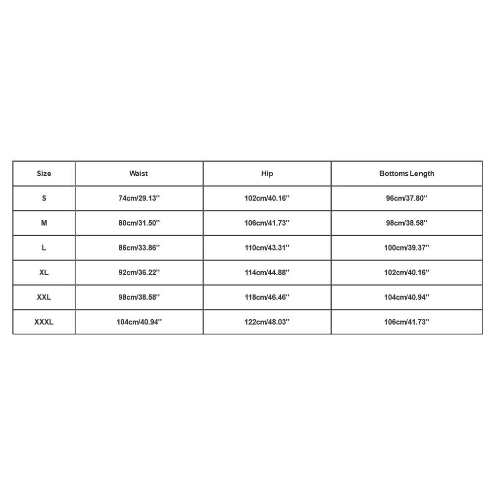 - XXXL: Waist 104cm/40.94”, Hip 122cm/48.03”, Bottoms Length 106cm/41.73”