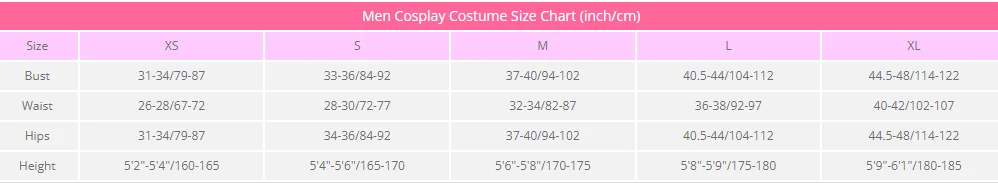 Men Cosplay Costume Size Chart (inch/cm)