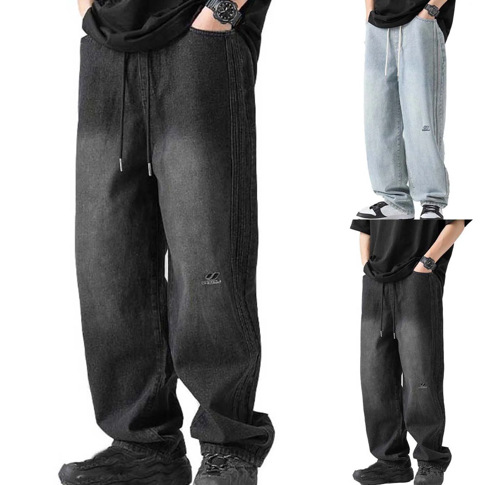 Men’s Vintage Baggy Jeans Denim Loose Retro Wash Jeans Side Patchwork Straight Pants