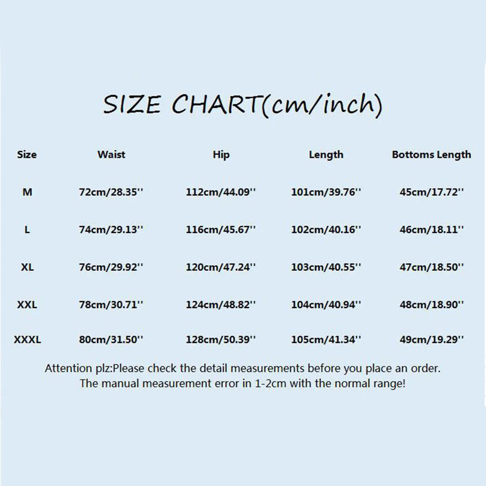 Size: XXXL, Waist: 80cm/31.50”, Hip: 128cm/50.39”, Length: 105cm/41.34”, Bottoms Length: 49cm/19.29”