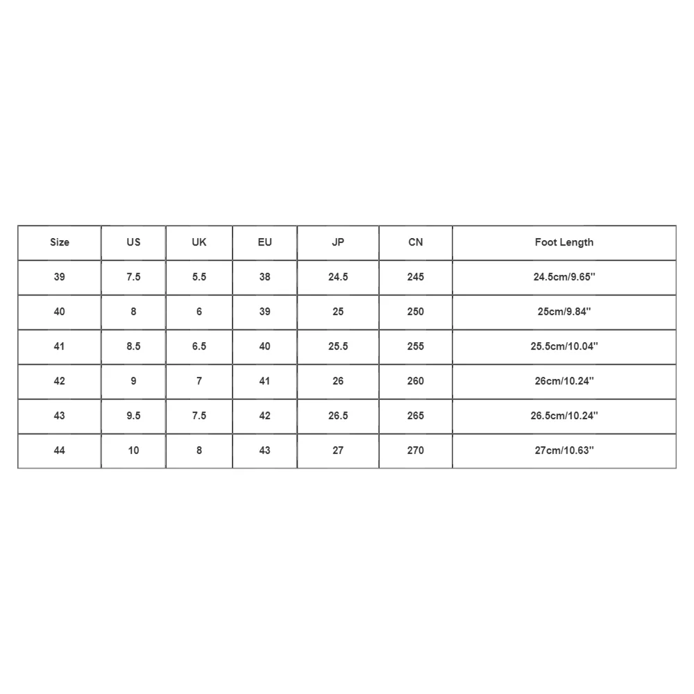 - Size 39: US 7.5, UK 5.5, EU 38, JP 24.5, CN 245, Foot Length 24.5cm/9.65”