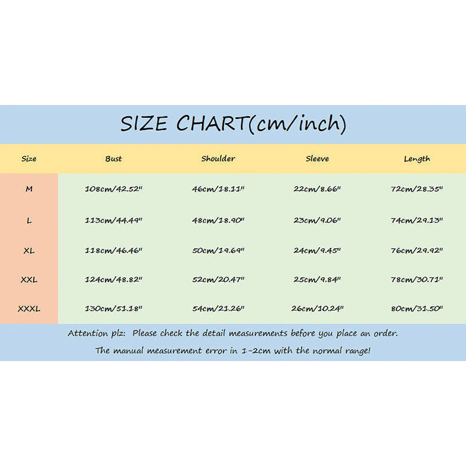 - XXL – Bust: 130cm/51.18” | Shoulder: 52.5cm/20.67” | Sleeve: 24cm/9.45” | Length: 78cm/30.71”