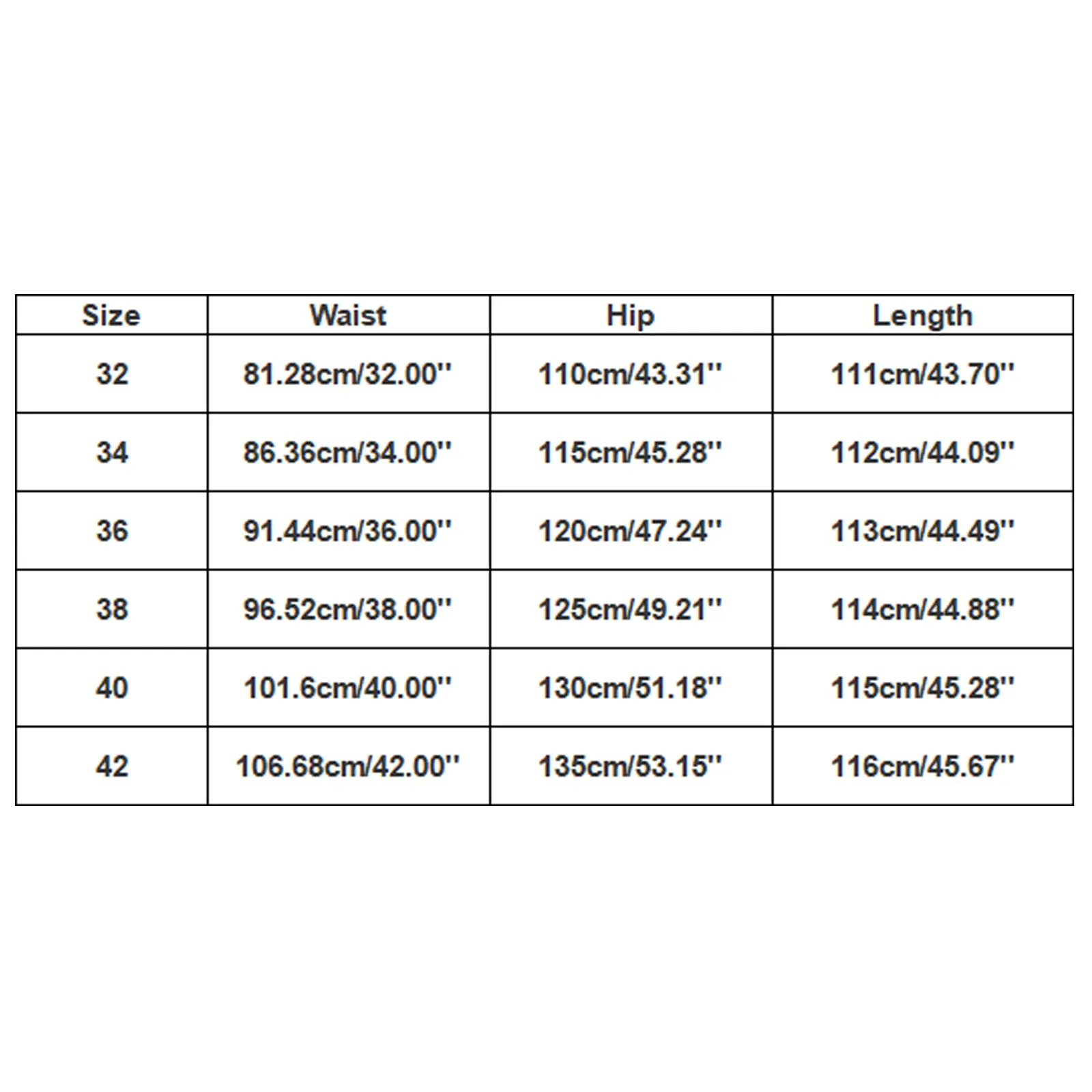 Size: 42, Waist: 106.68cm/42.00”, Hip: 135cm/53.15”, Length: 116cm/45.67”