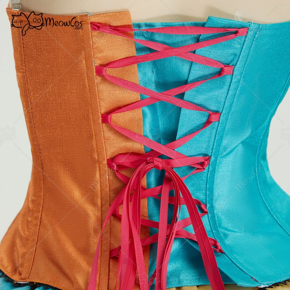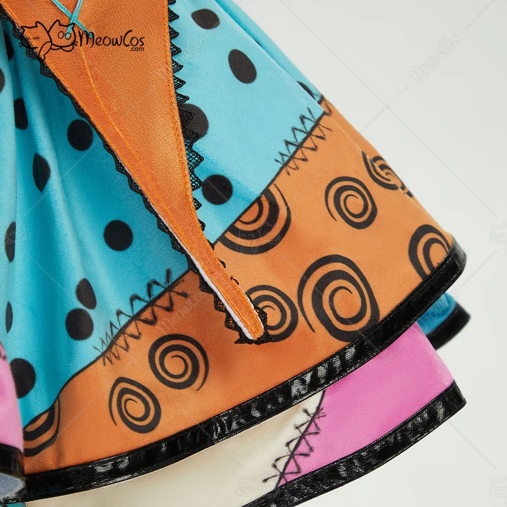 - This woman’s gothic costume set features soft materials, colorful patchwork, lace-up detail, a deep V-neck corset, a double-layered skirt, and a bat headband.