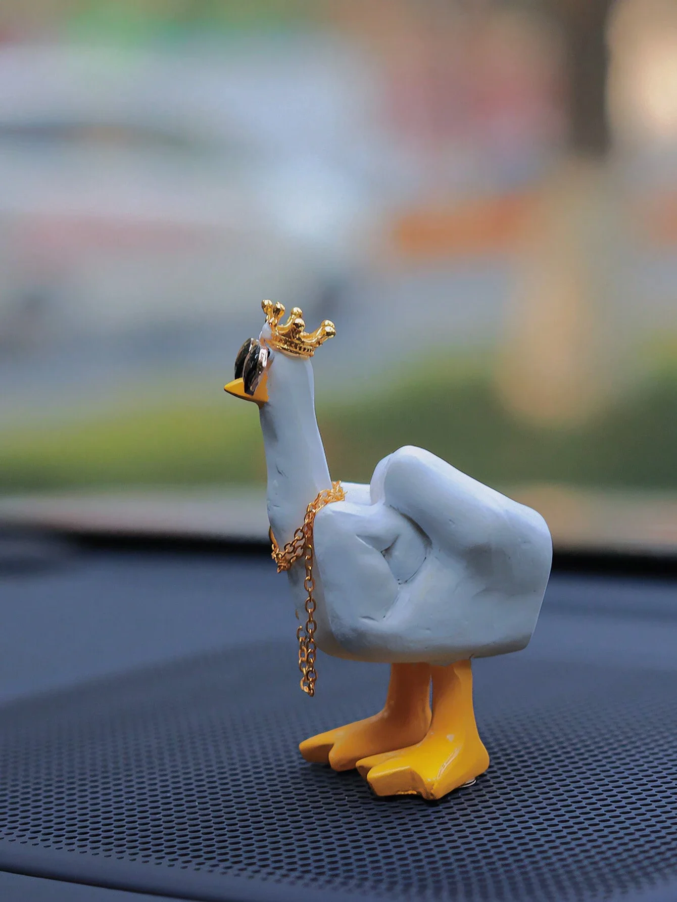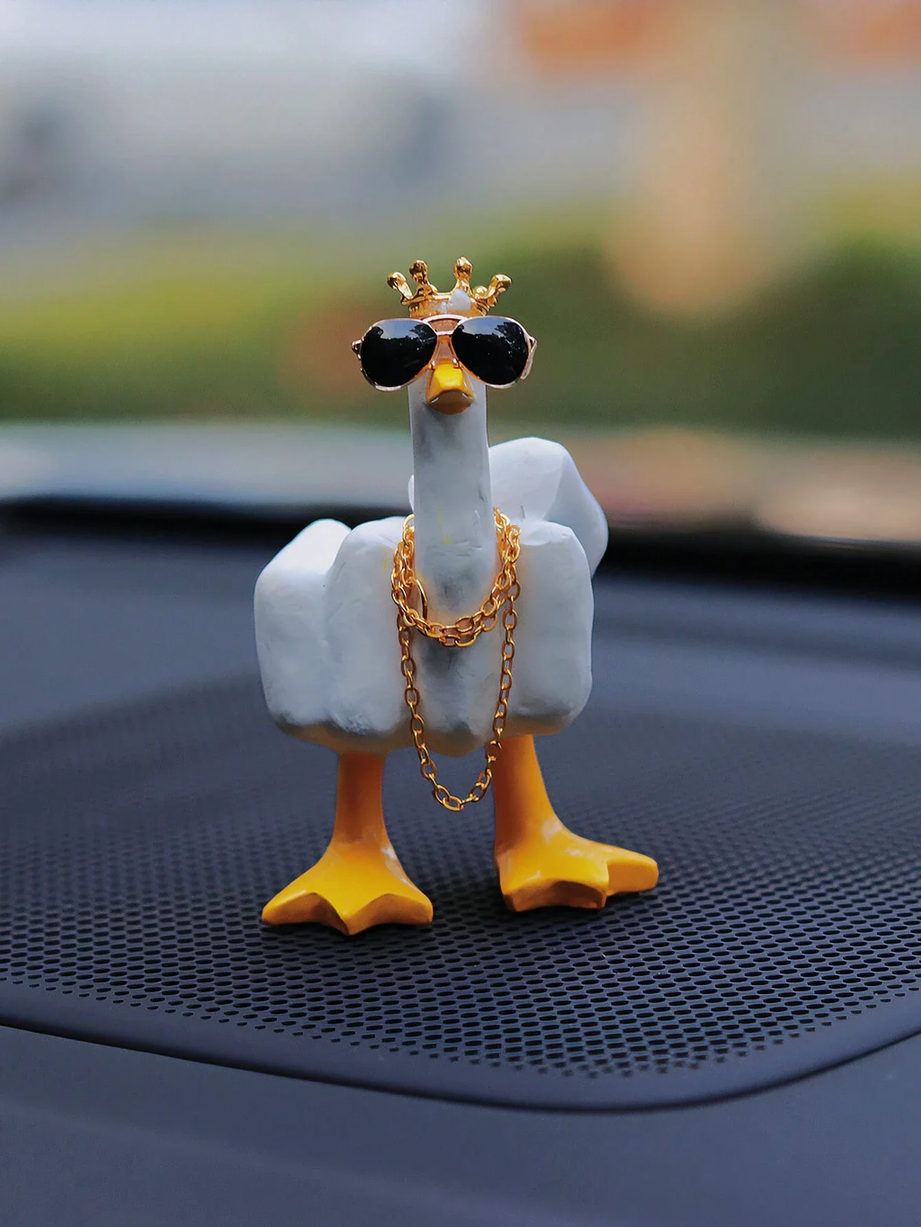 - Show off your fun and sassy side with this Middle Finger Duck-Shaped Car Dashboard Ornament, complete with stylish sunglasses and a chain accessory in a bold white color.