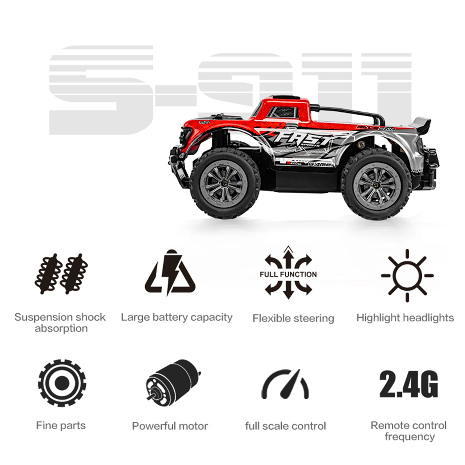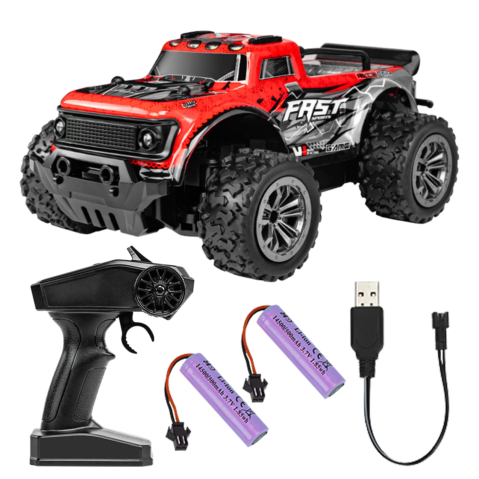 - Functions: Forward, backward, left turn, right turn, full throttle ratio, 2-speed express switch, light switch. The car is impact-resistant, wear-resistant, and can reach speeds of over 25km/h.