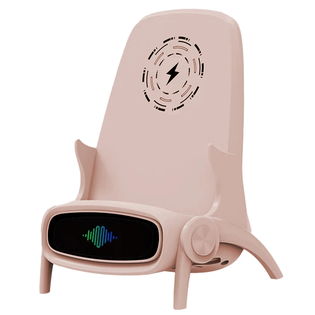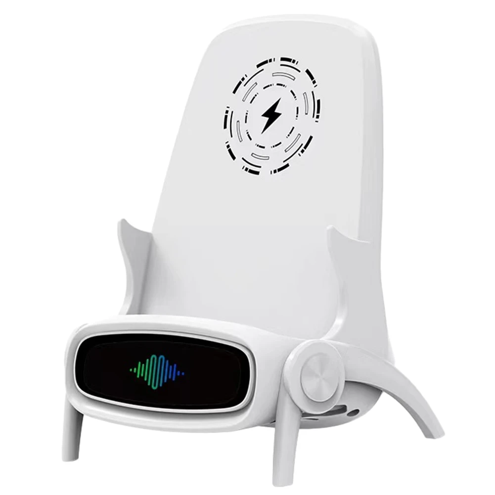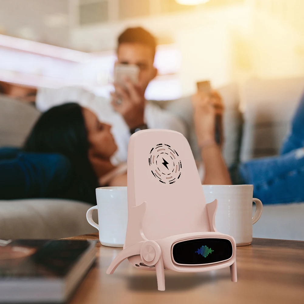 Versatile Design: This wireless phone charger station is uniquely shaped like a chair, offering the flexibility to charge your phone either horizontally or vertically. Its design doubles as a phone support, making it a versatile and multifunctional accessory for your device.