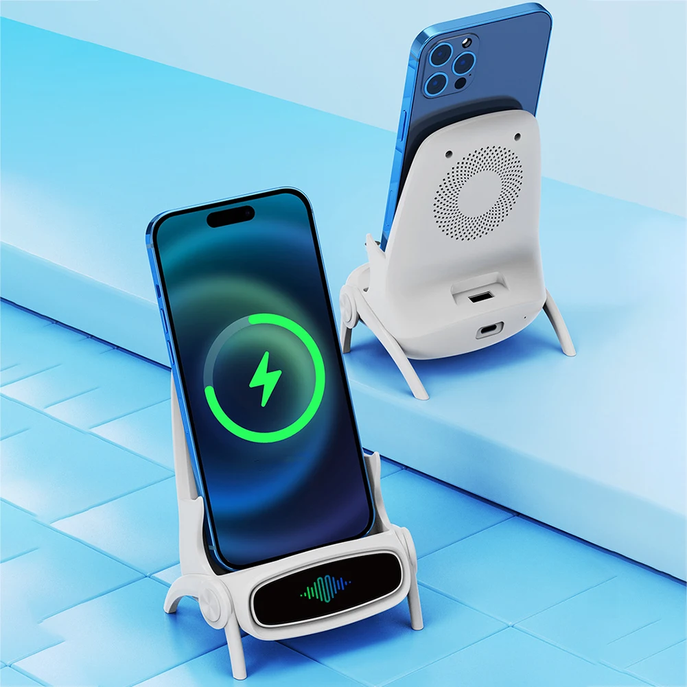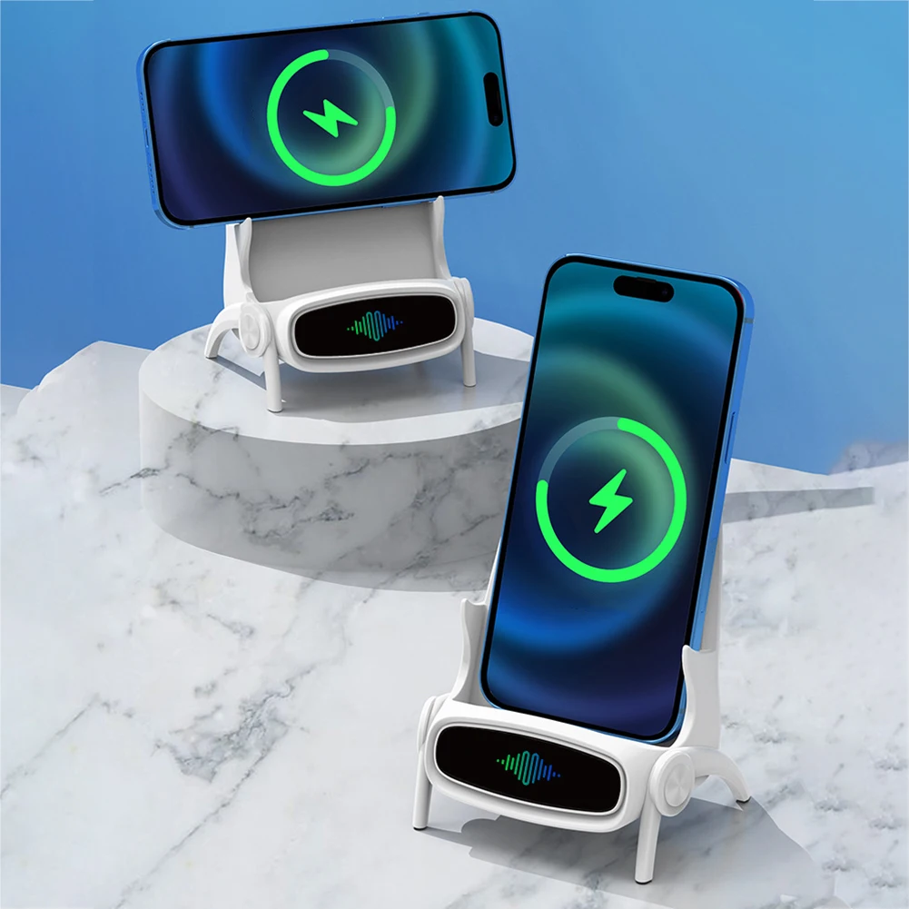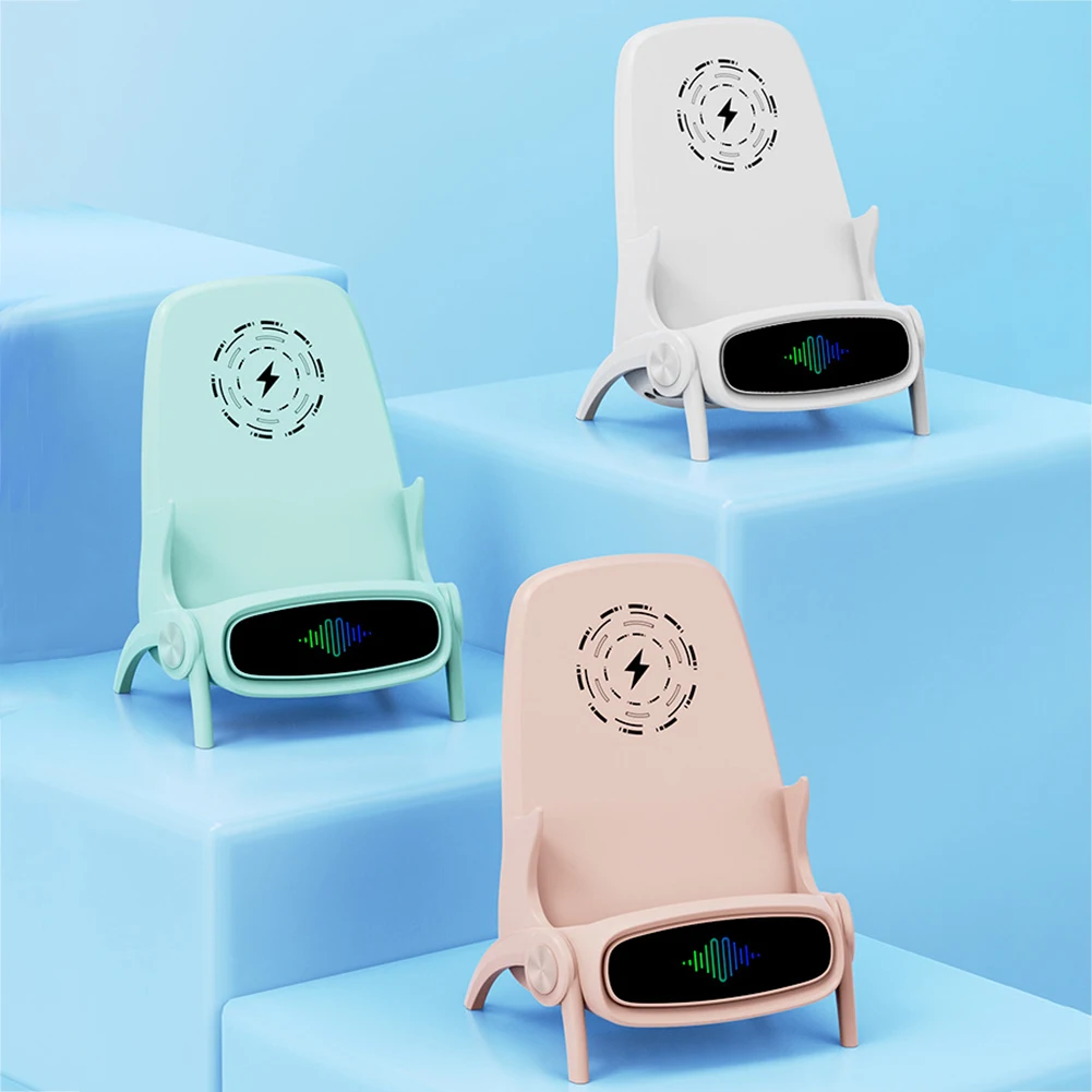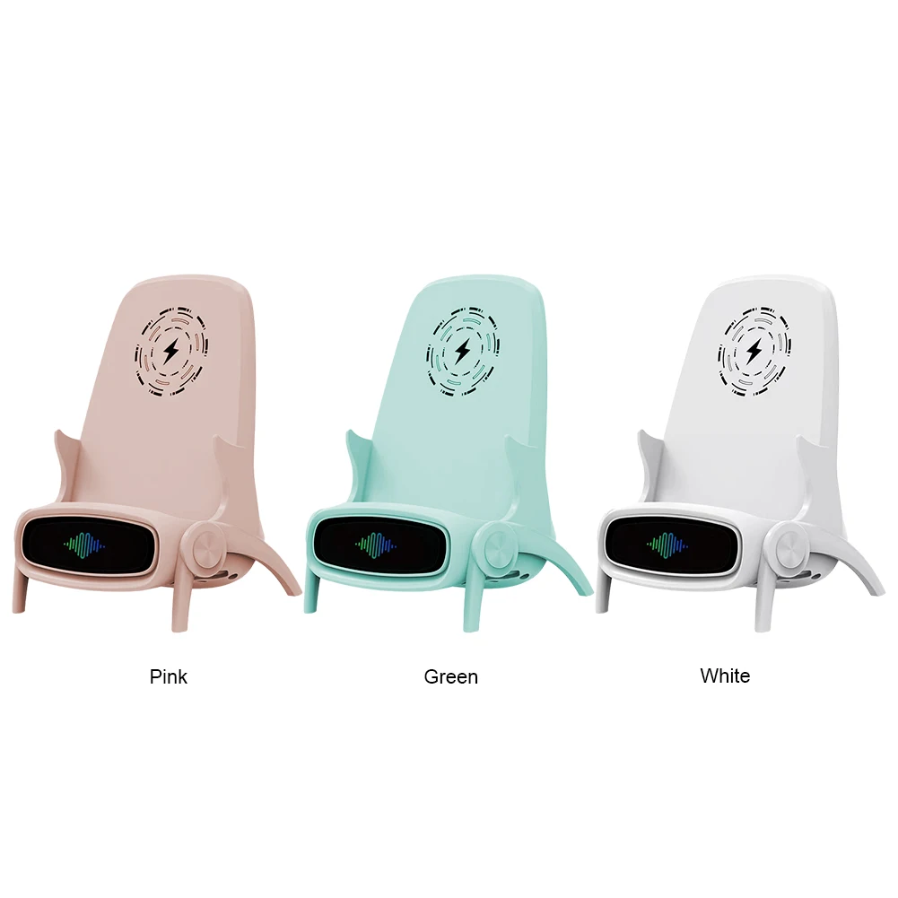 Versatile Design: This wireless phone charger station is uniquely shaped like a chair, offering the flexibility to charge your phone either horizontally or vertically. Its design doubles as a phone support, making it a versatile and multifunctional accessory for your device.