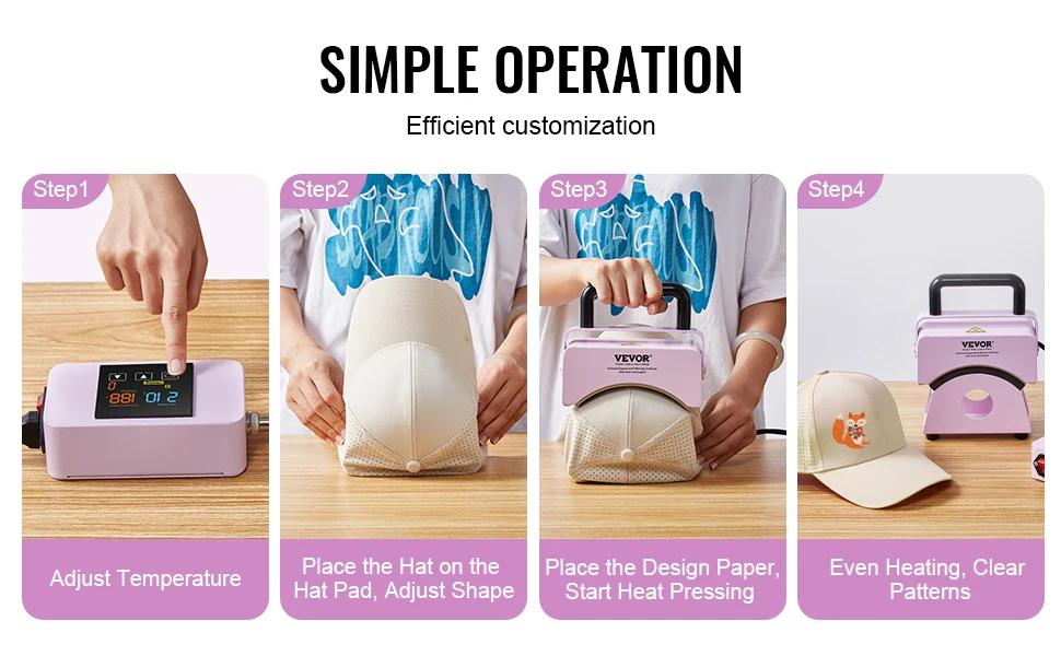 Precision Heat Transfer: This multifunctional portable hat press easily brings your DIY designs to life. With a curved ceramic-coated heating element, it conforms to the shape of caps, ensuring even heat distribution and sharp, vivid transfers that expand your creative possibilities.