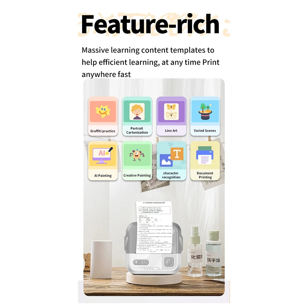 - Main functions: document printing, photo printing, wrong question printing, sketch board, built-in pattern, voice broadcast, banner printing, text extraction, voice note, web page printing